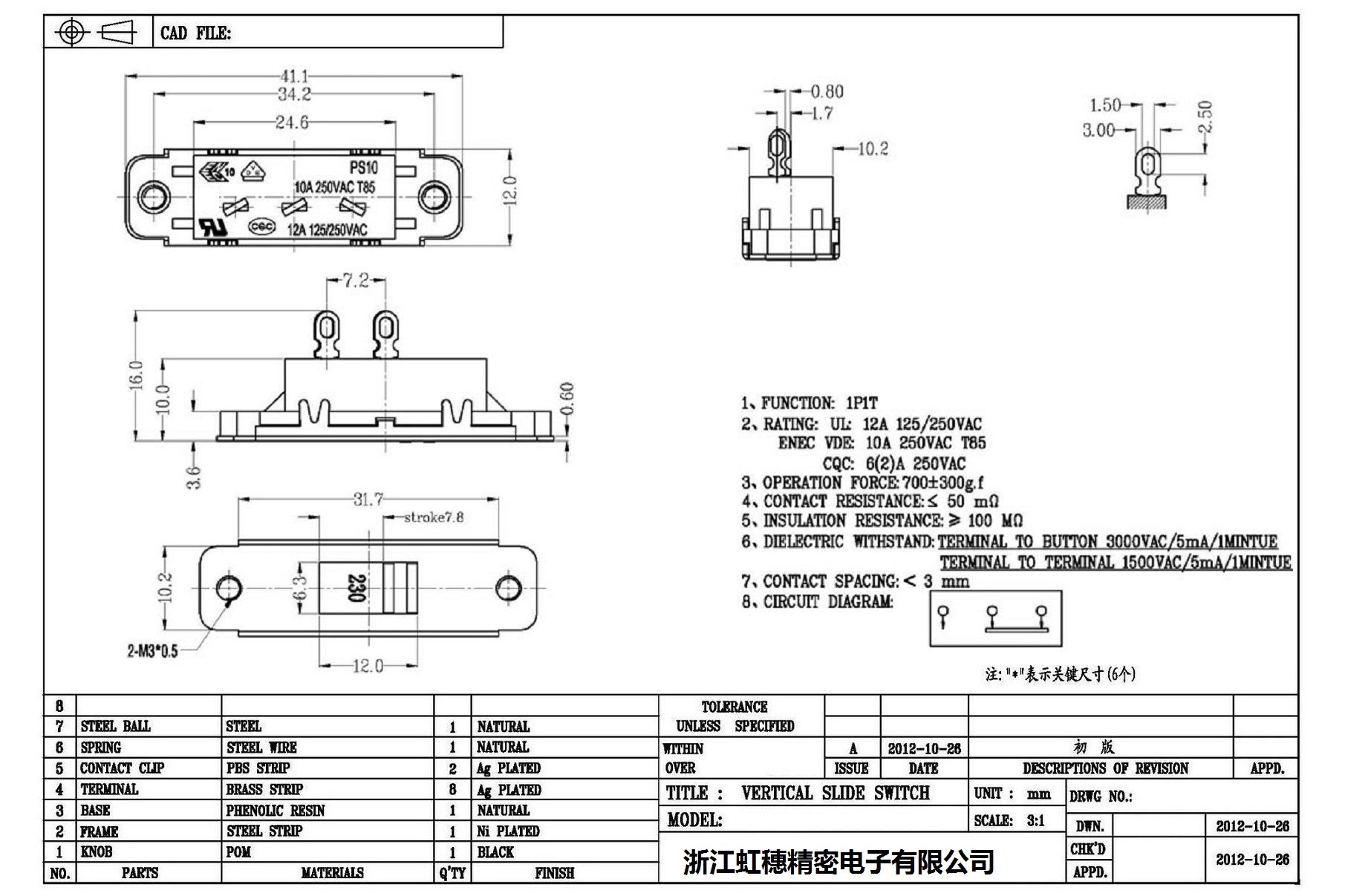 电源滑动开关/电源拨动开关 /技术参数