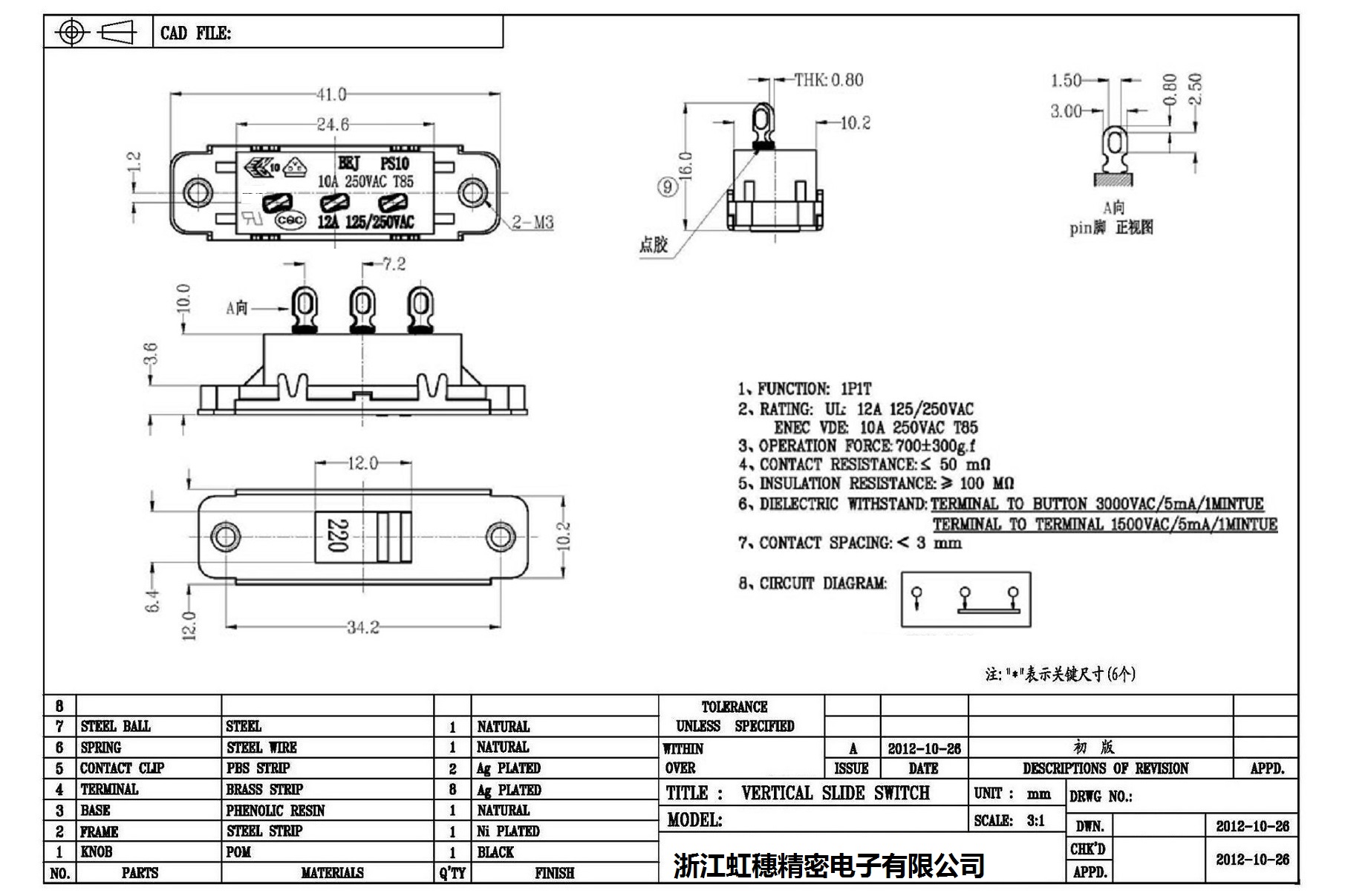 3、操作力1200士400g.f4、接触电阻:≤50mn5、绝缘电阻≥100 Ma