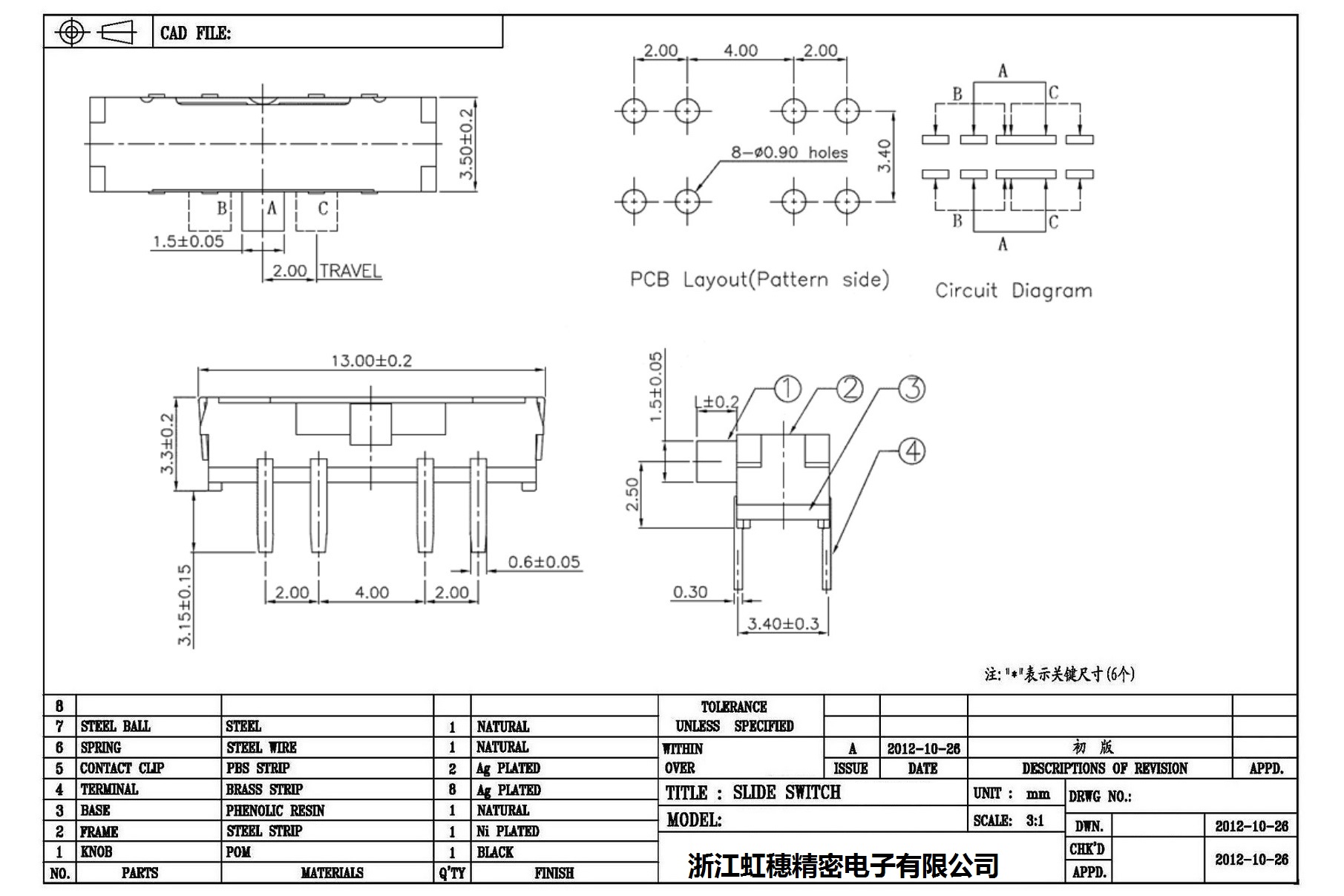 迷你拨动开关侧拨 技术参数: