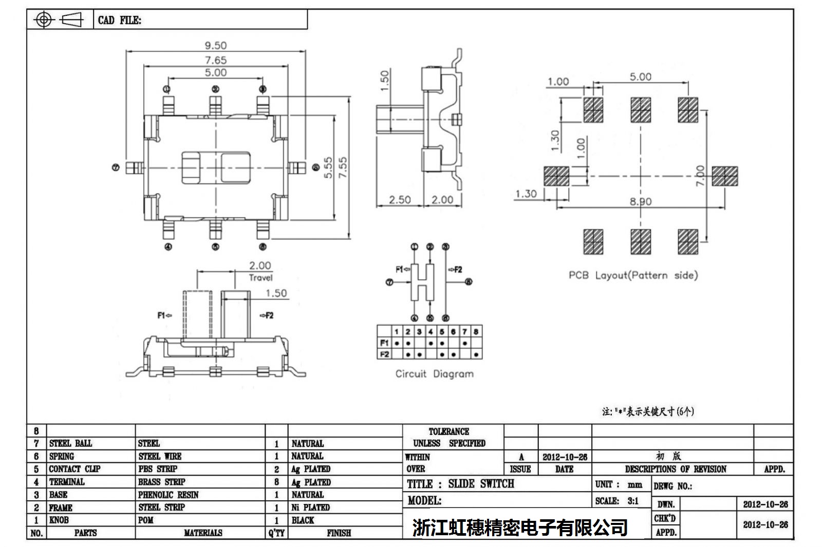 迷你拨动开关侧拨 技术参数: