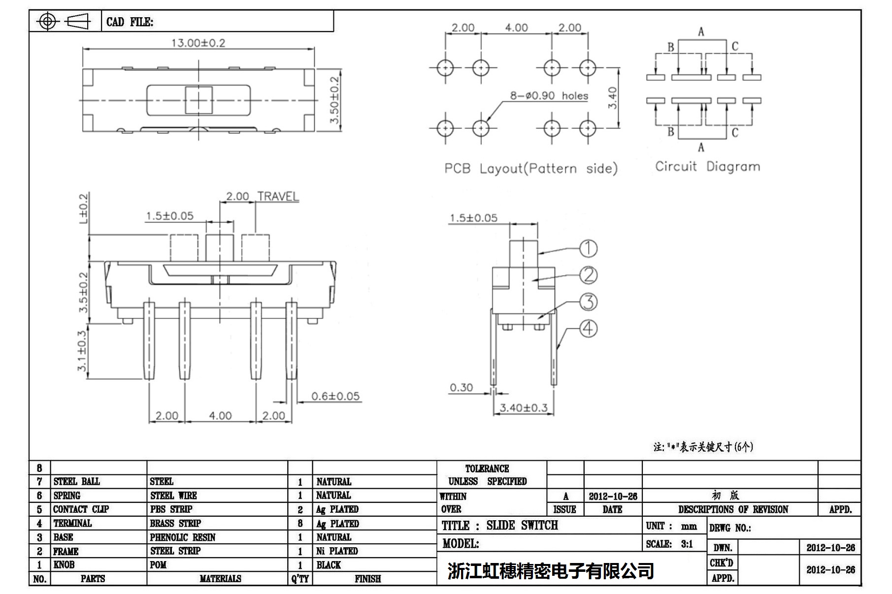 迷你拨动开关侧拨 技术参数: