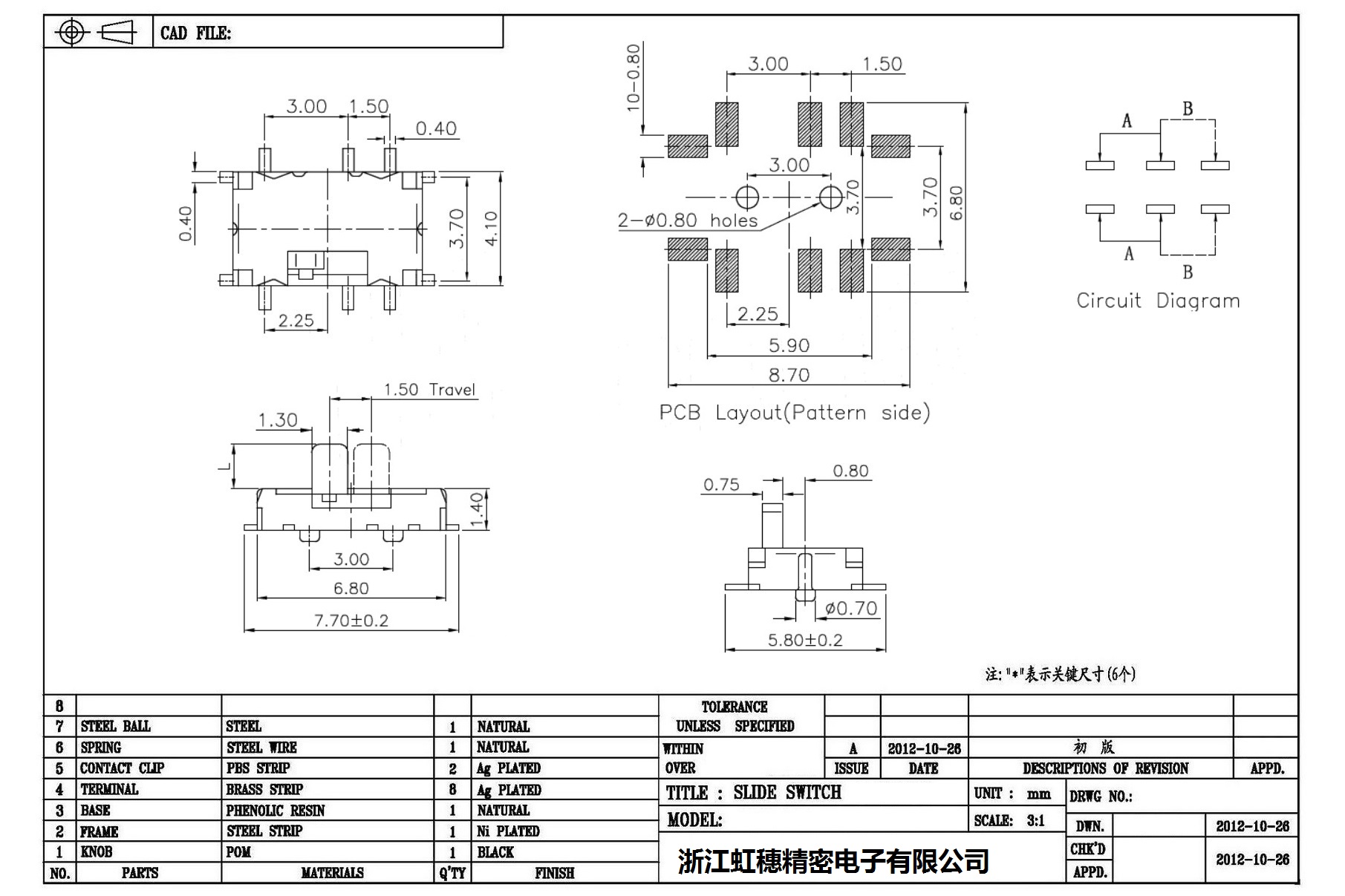 迷你拨动开关侧拨 技术参数: