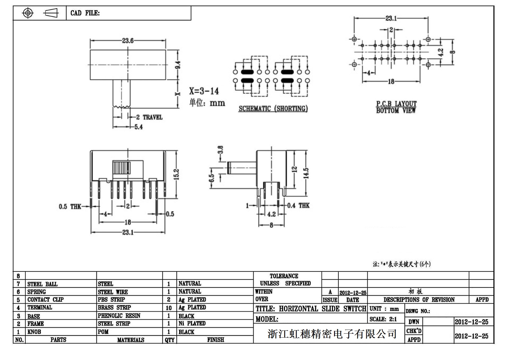 Horizontal toggle switch sidedial/horizontal slide switch technical indicators