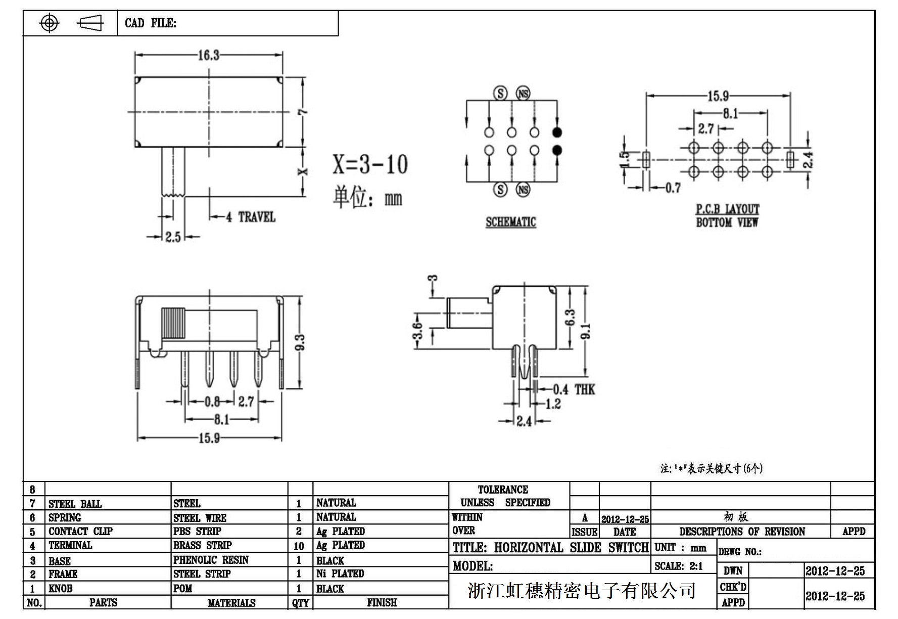 卧式拨动开关侧拨技术指标
