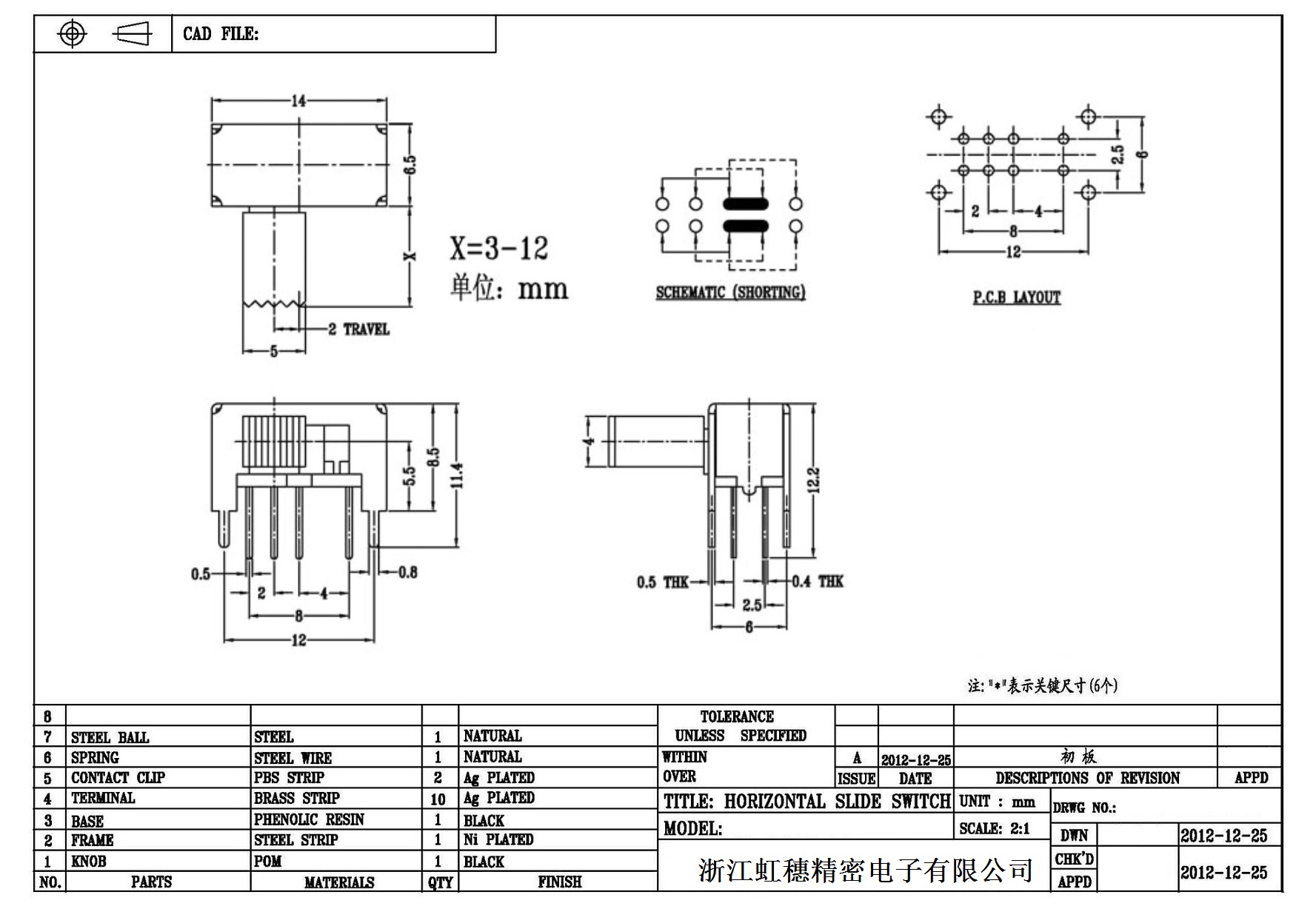 Horizontal toggle switch sidedial/horizontal slide switch technical indicators