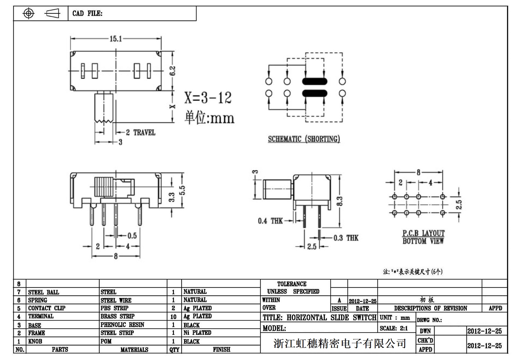卧式拨动开关侧拨技术指标