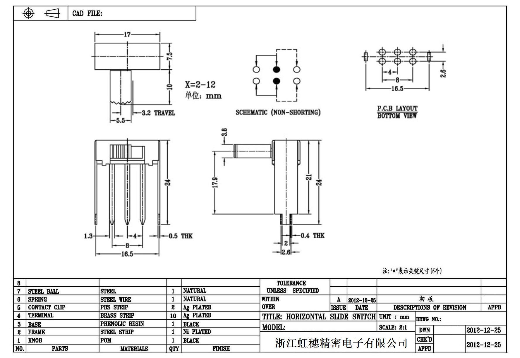 Horizontal toggle switch sidedial/horizontal slide switch technical indicators