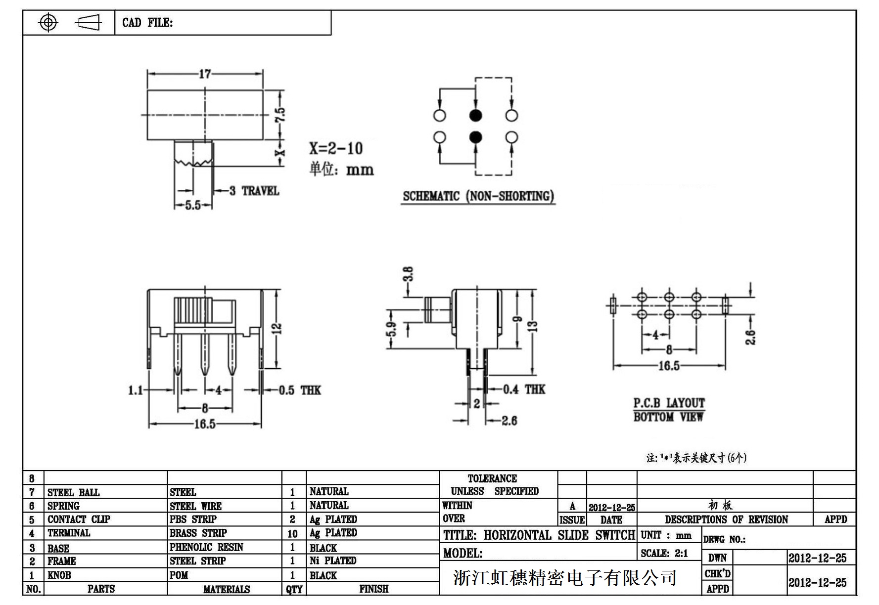 卧式拨动开关侧拨技术指标