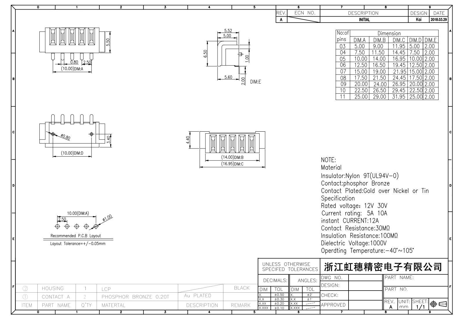 表面镀层:金在镍/锡之上,镀层厚度3U″