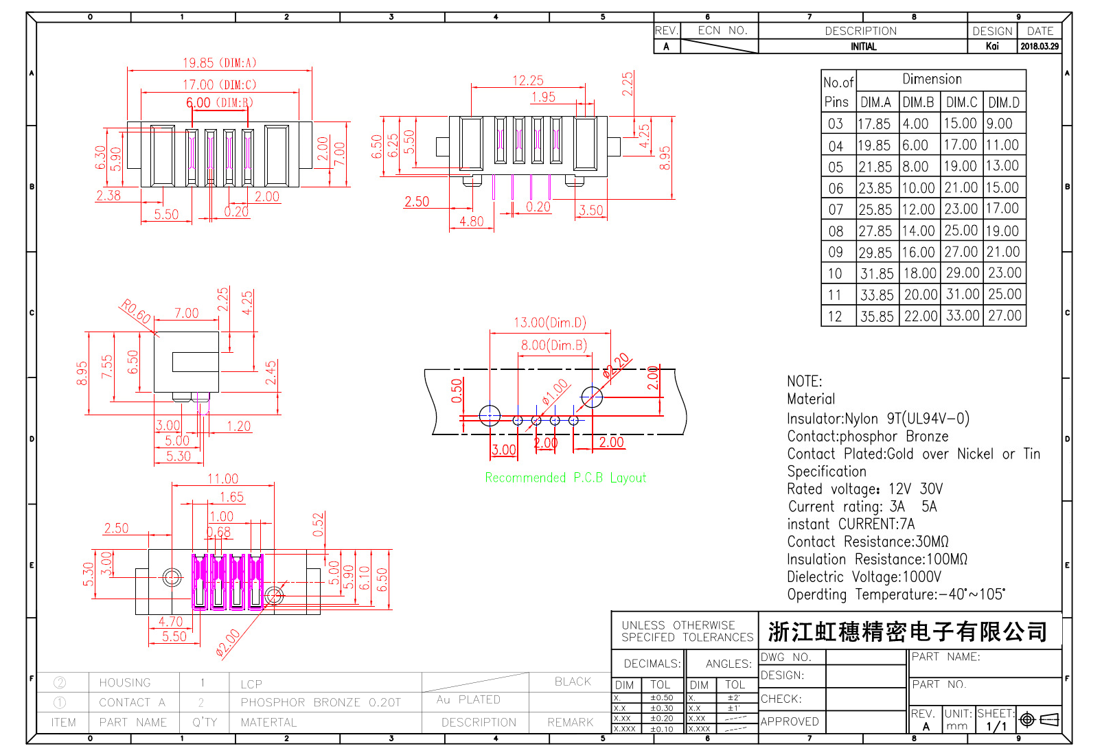 表面镀层:金在镍/锡之上,镀层厚度3U