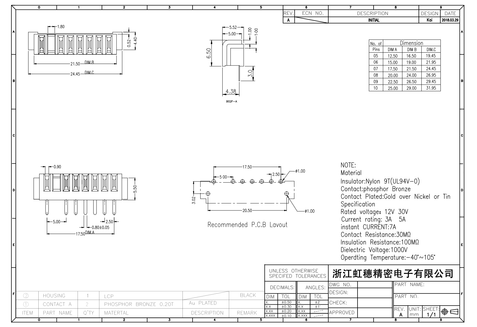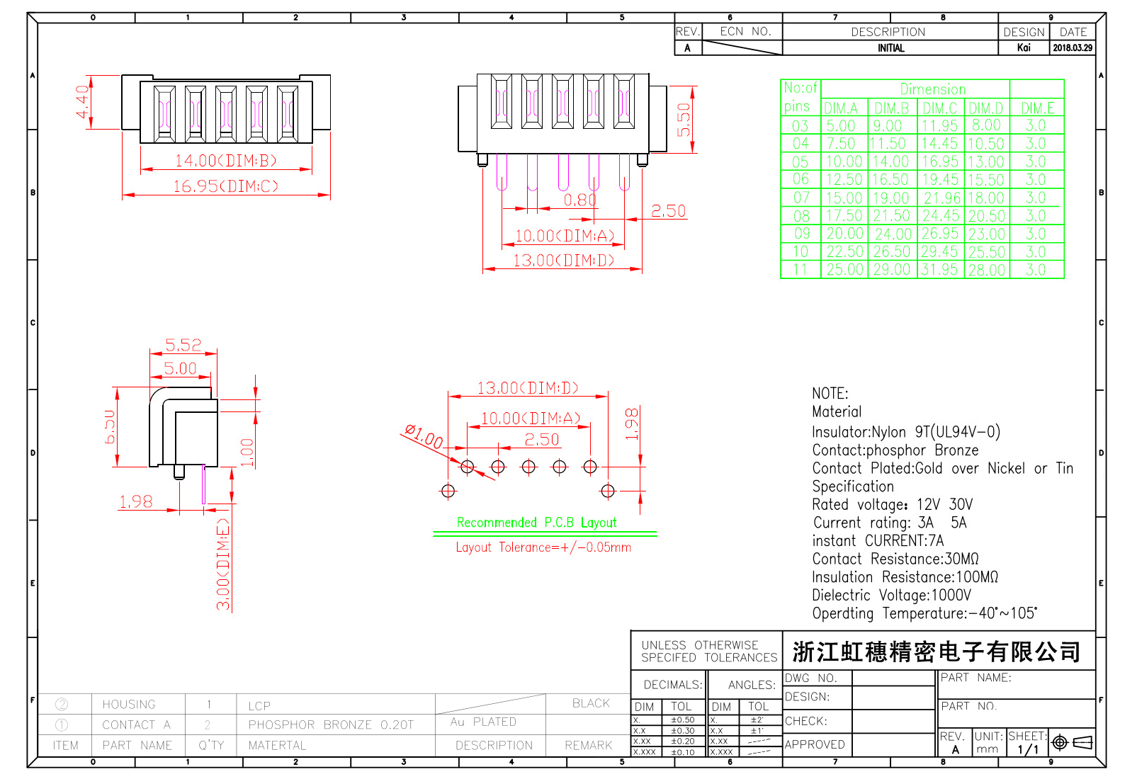 表面镀层:金在镍/锡之上,镀层厚度3U″