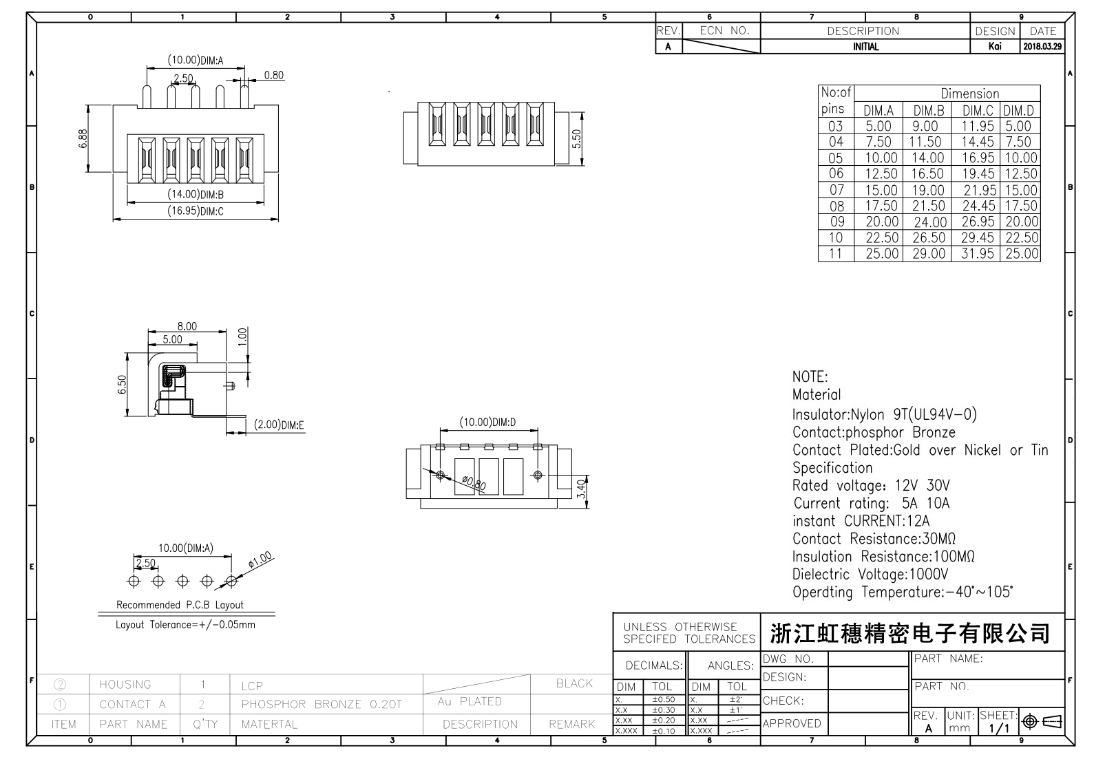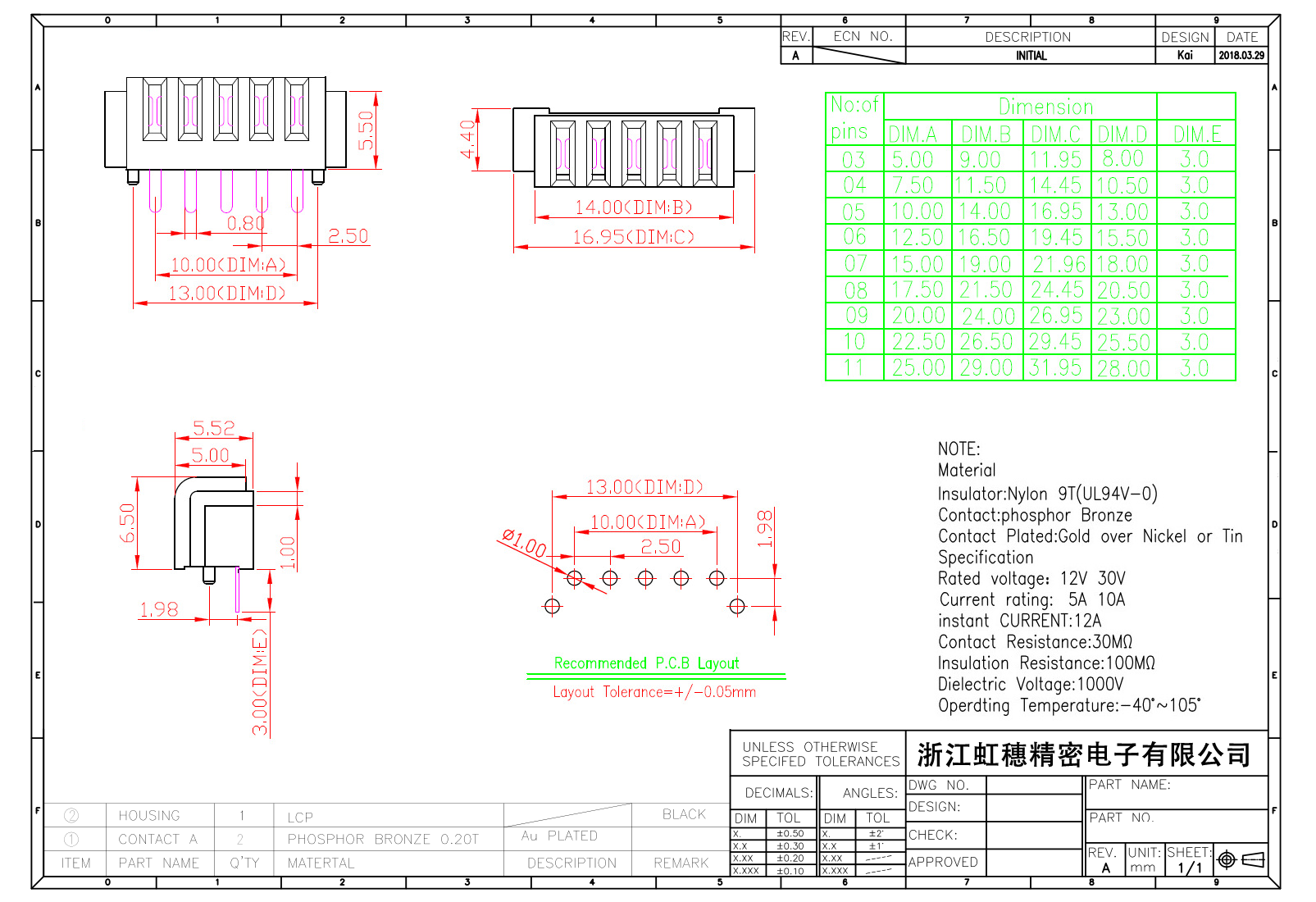 表面镀层:金在镍/锡之上,镀层厚度3U