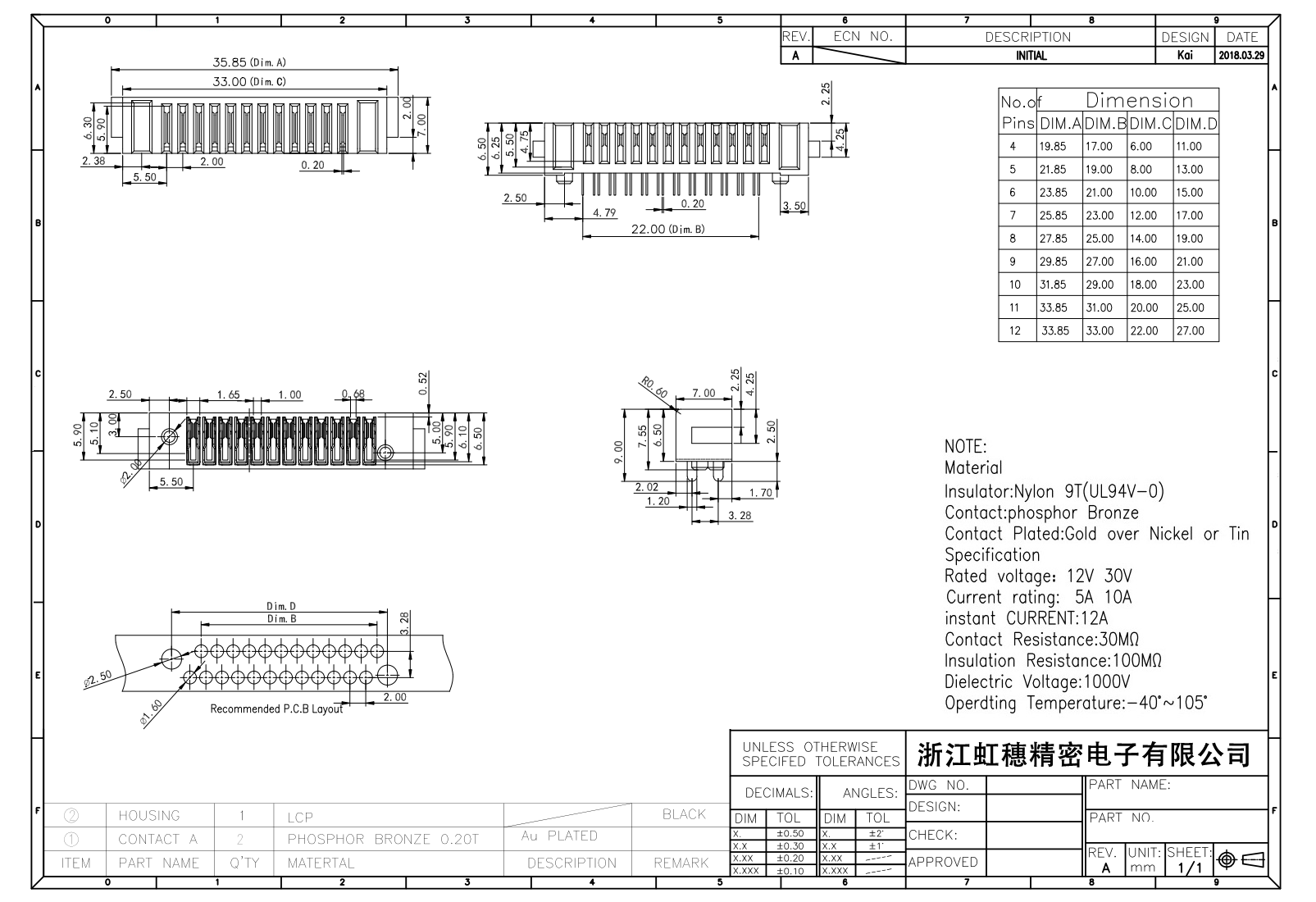 表面镀层:金在镍/锡之上,镀层厚度3U