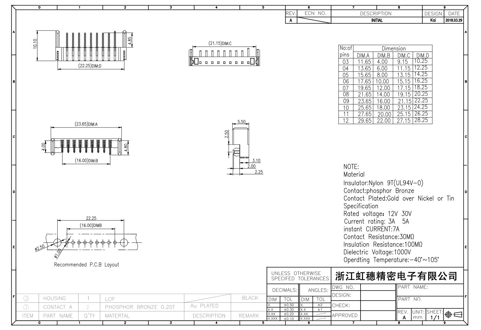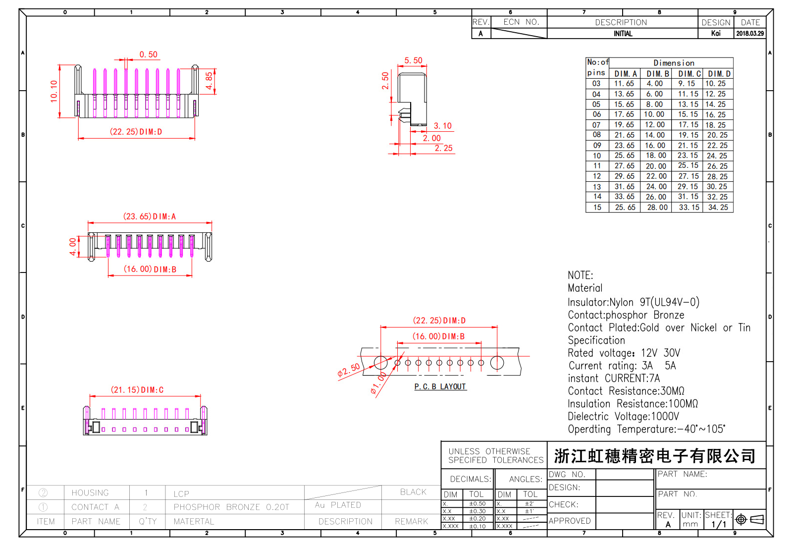 表面镀层:金在镍/锡之上,镀层厚度3U″