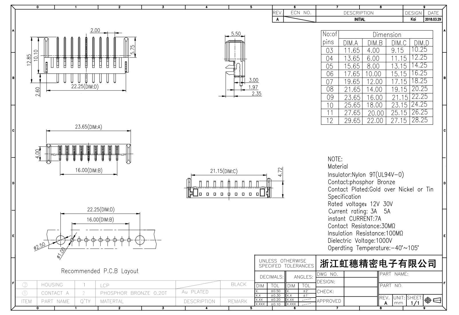 表面镀层:金在镍/锡之上,镀层厚度3U