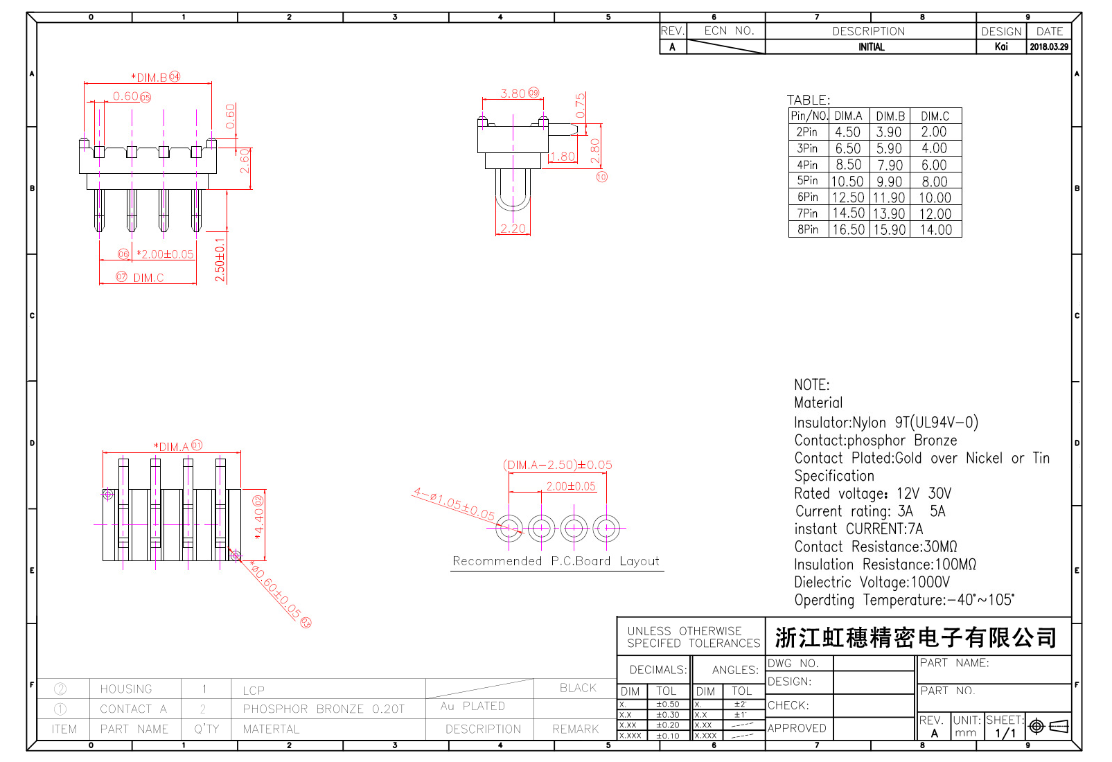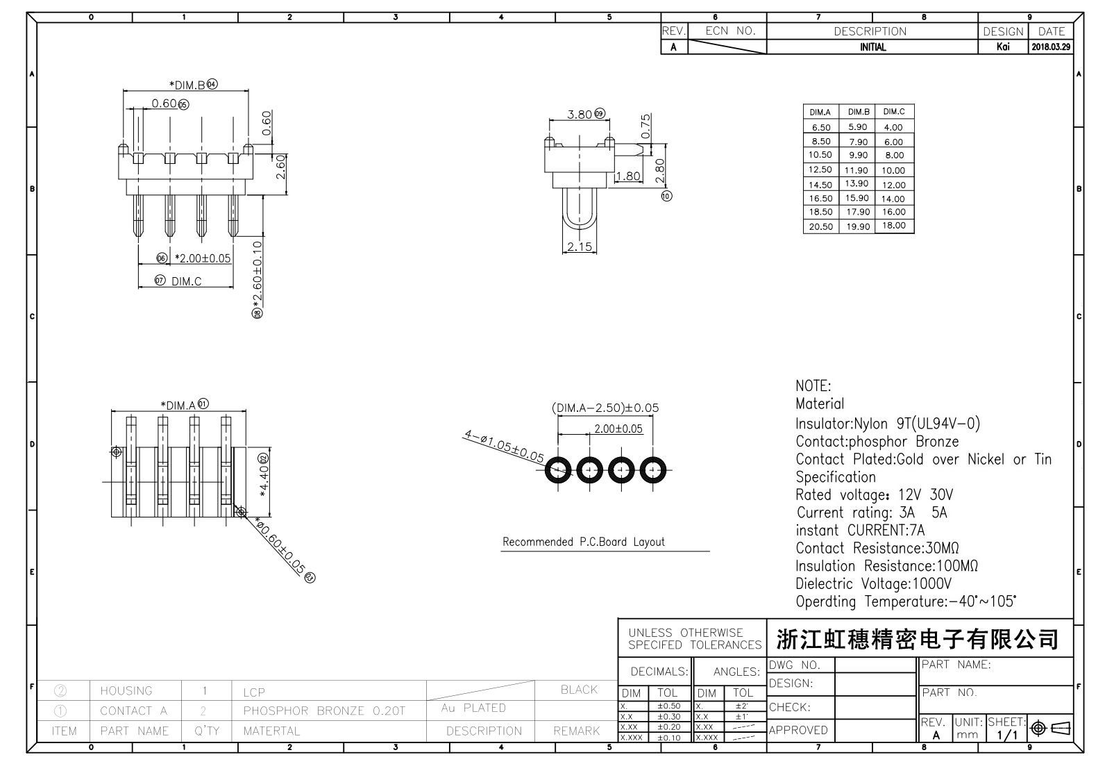 表面镀层:金在镍/锡之上,镀层厚度3U″