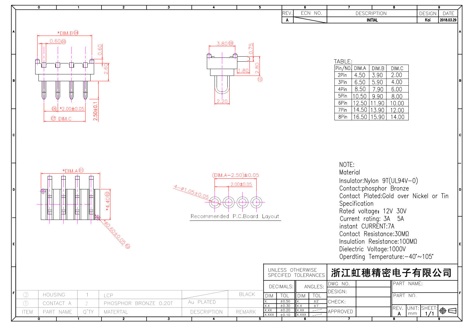 表面镀层:金在镍/锡之上,镀层厚度3U″
