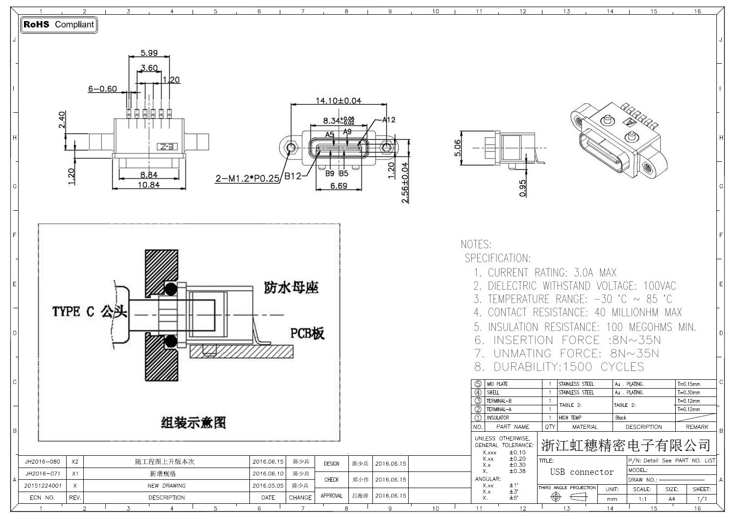 USB TypeC防水母座技术参数: