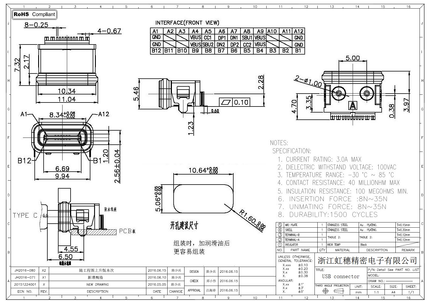 USB TypeC防水母座技术参数:
