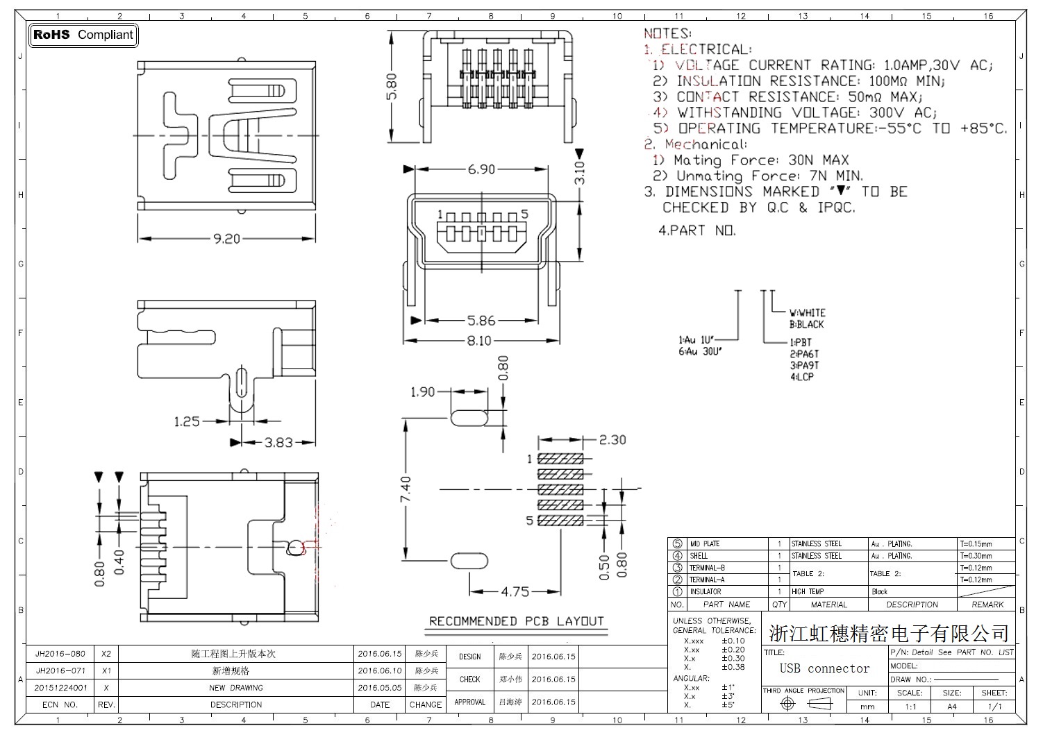 MINI USB插座技术参数: