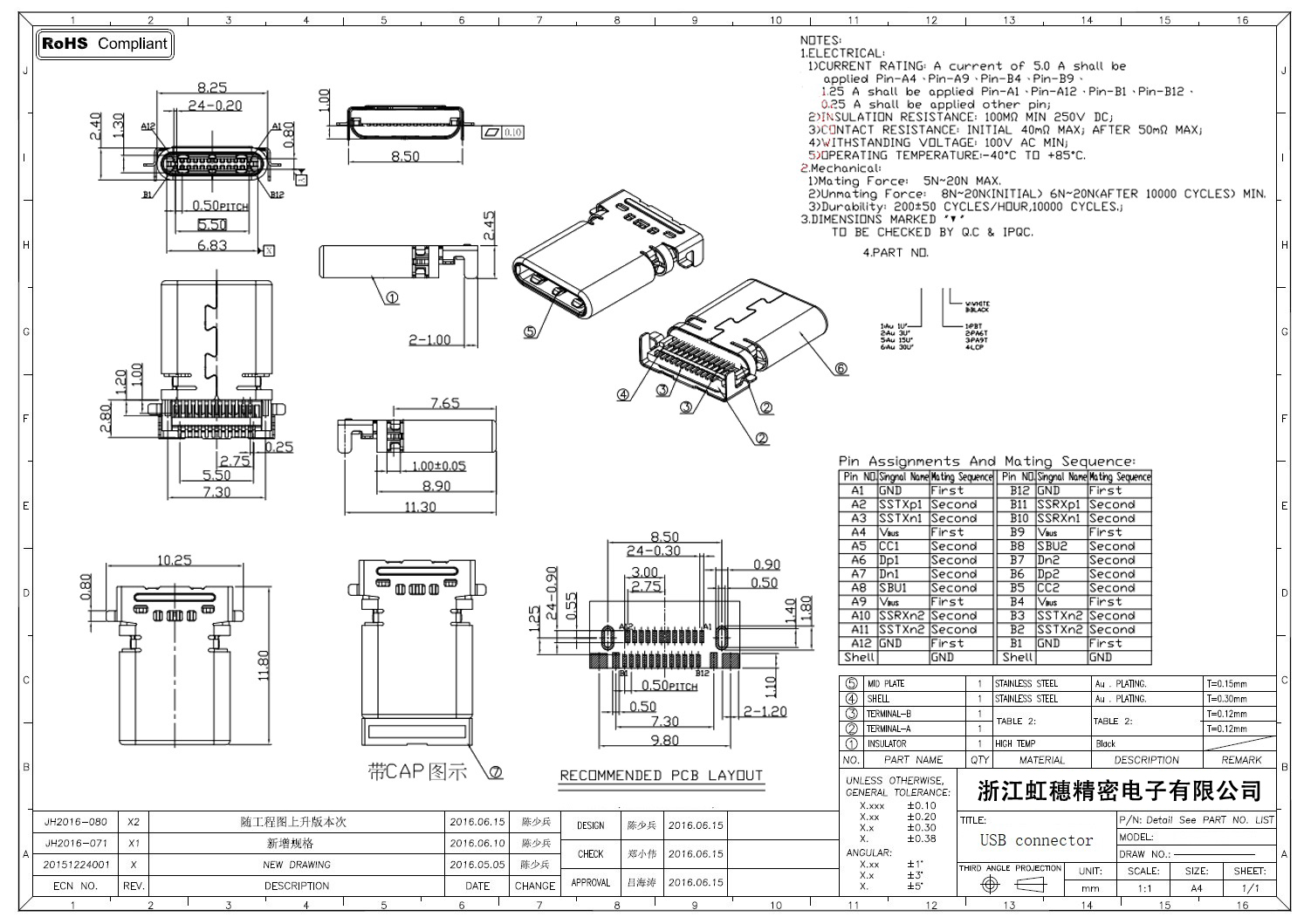 USB Type C母座技术参数: