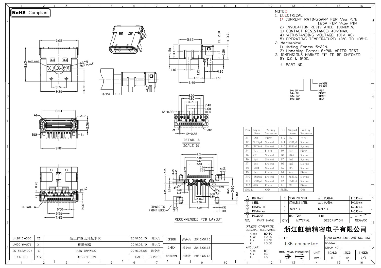 USB Type C母座技术参数: