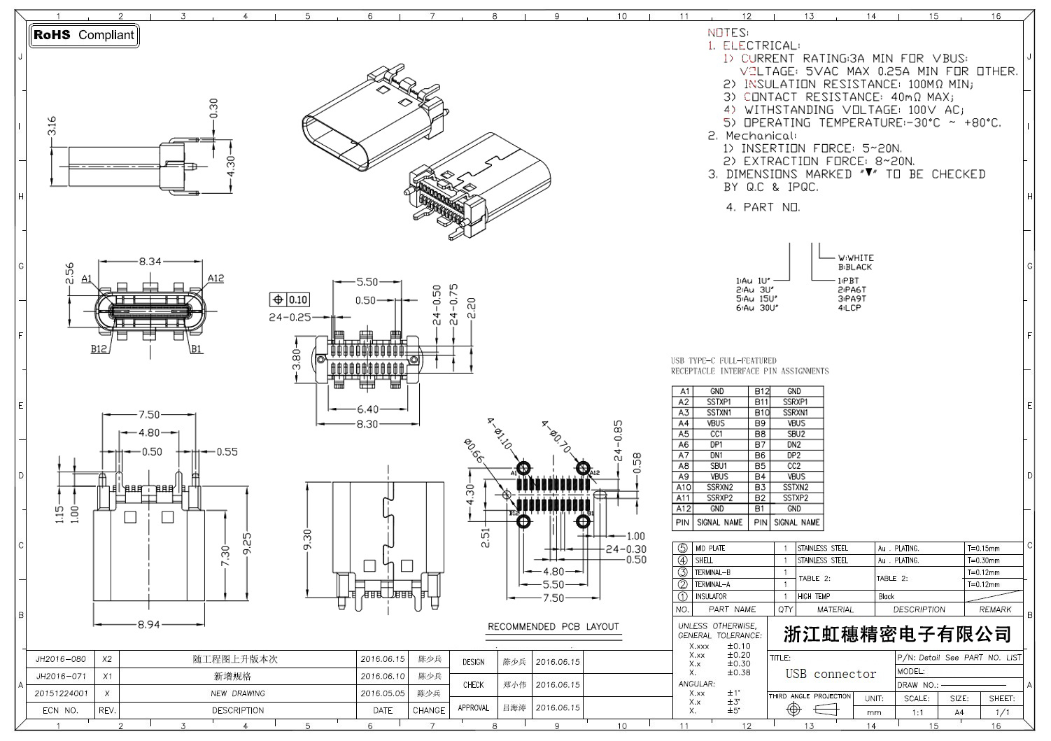 USB Type C母座技术参数: