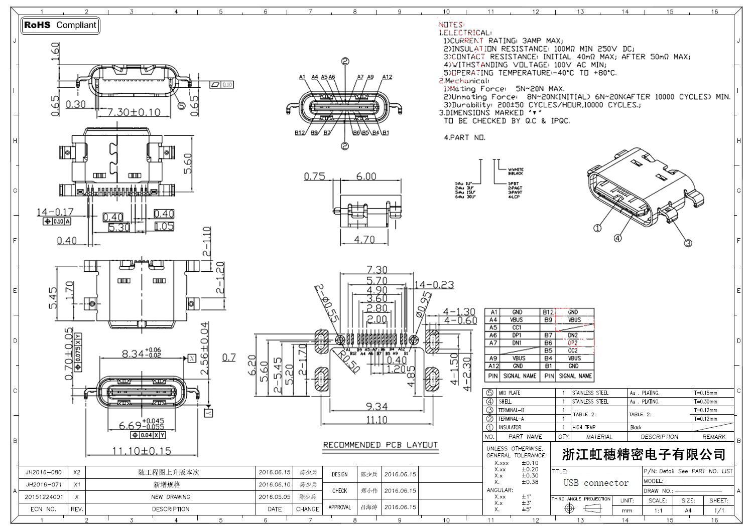USB Type C母座技术参数: