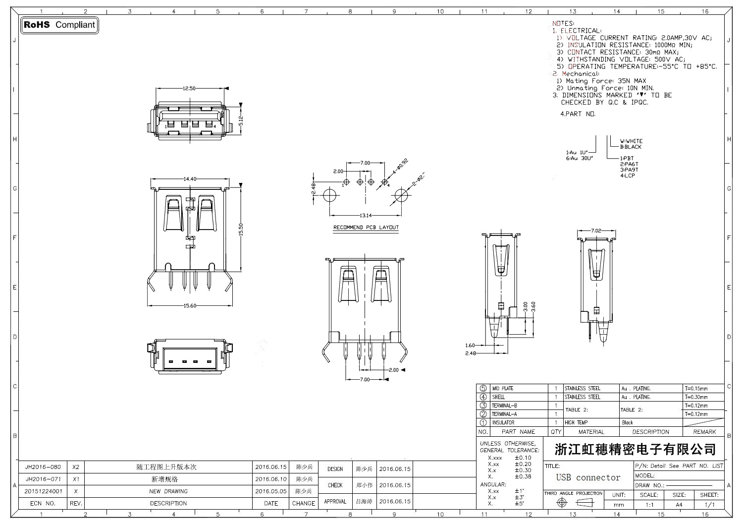 2.0USB插座技术参数: