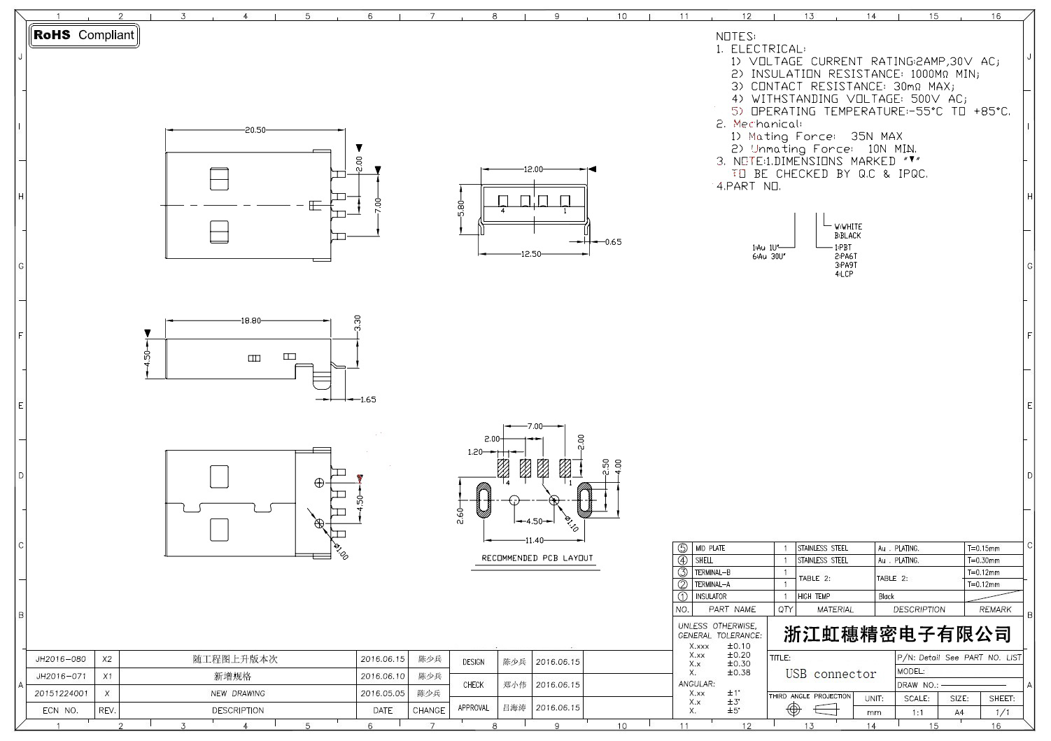 2.0USB插座技术参数: