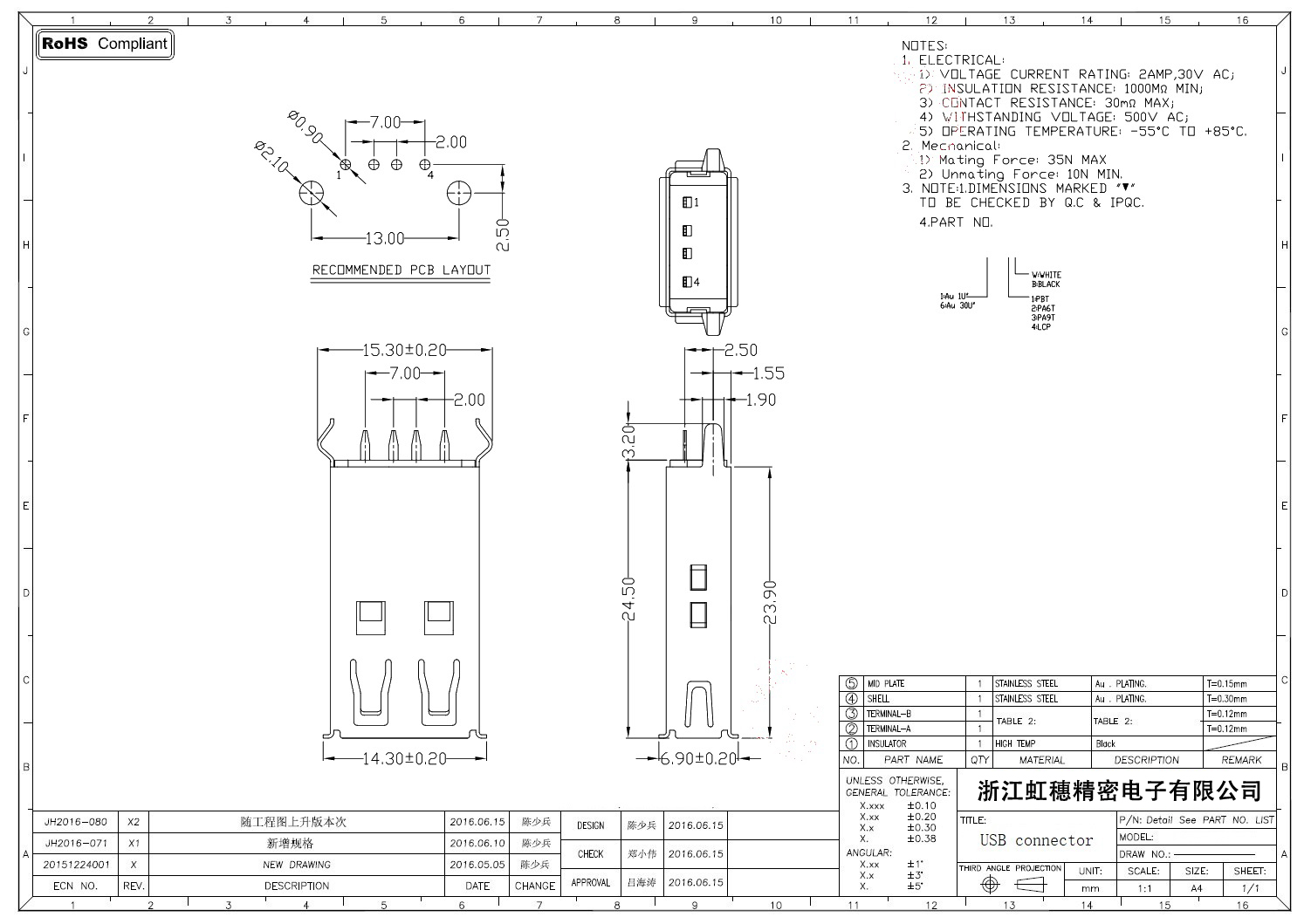 2.0USB插座技术参数: