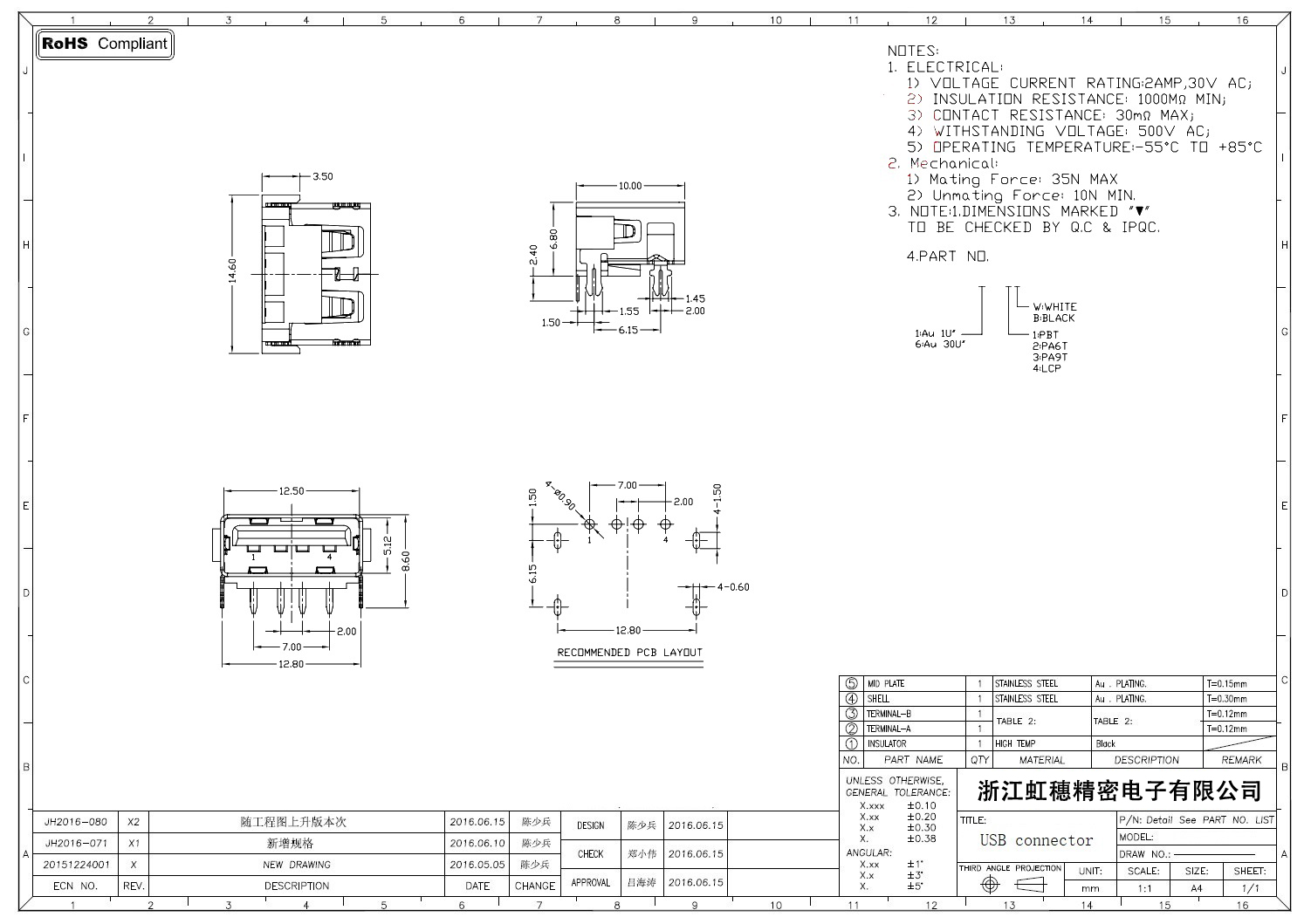 2.0USB插座技术参数: