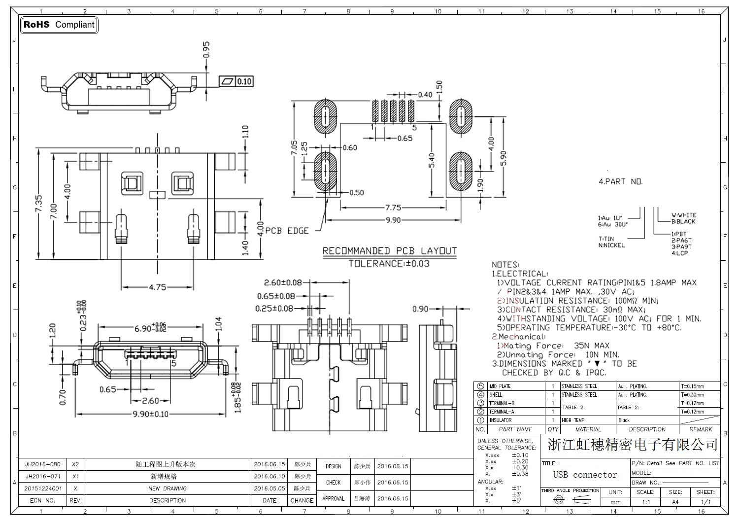 MICRO USB插座技术参数: