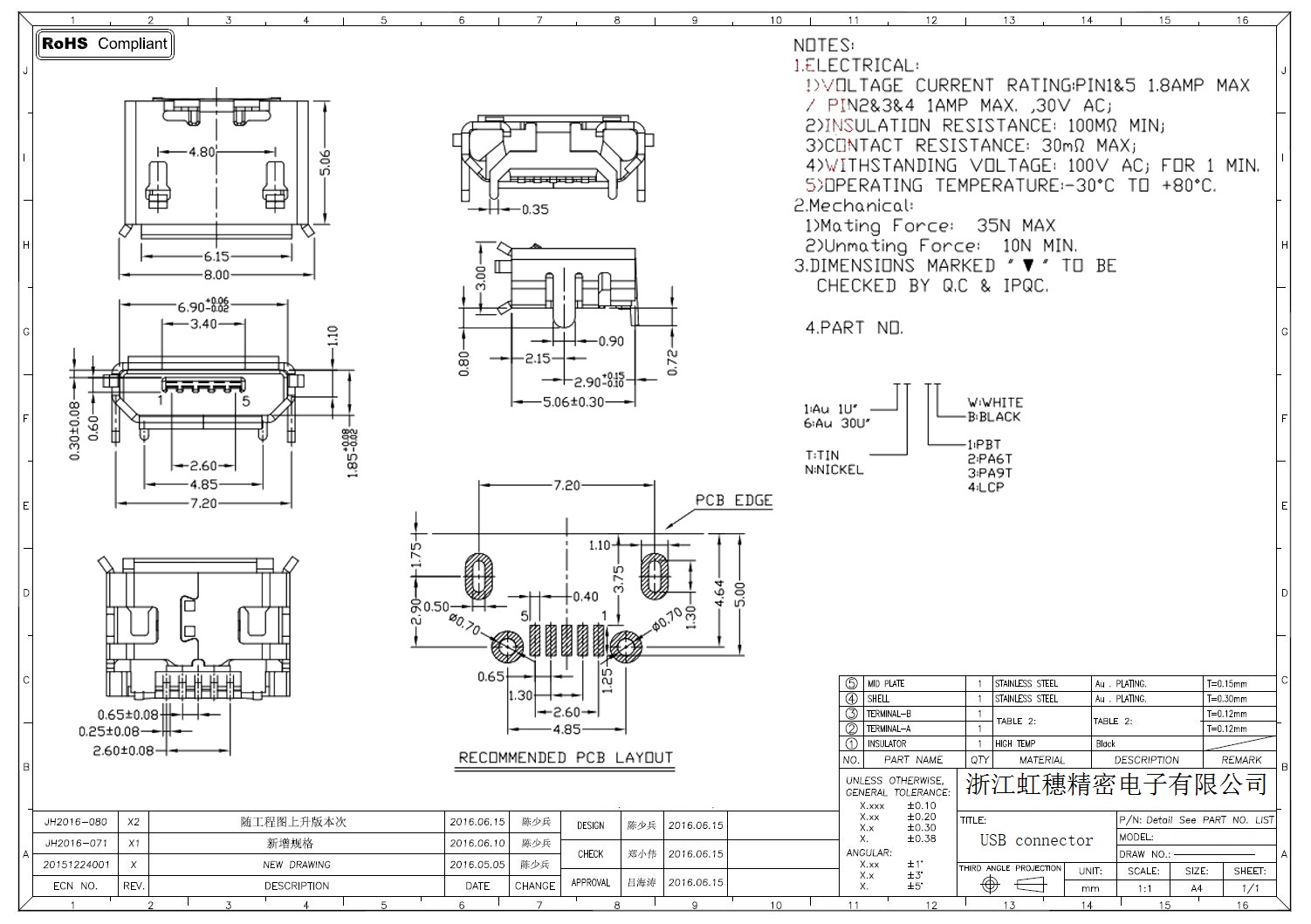 MICRO USB插座技术参数: