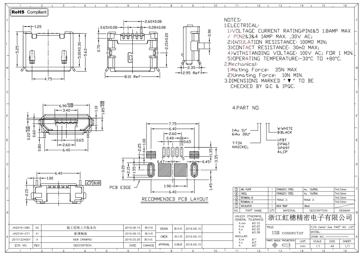 MICRO USB插座技术参数: