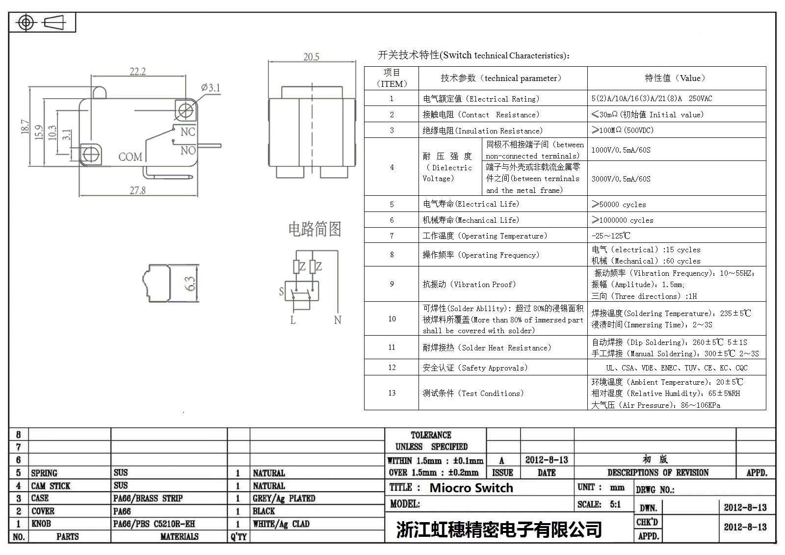 .请根据额定值电流、操作负载、驱动杆的种类、使用温度等要求选择合适型号的开关;