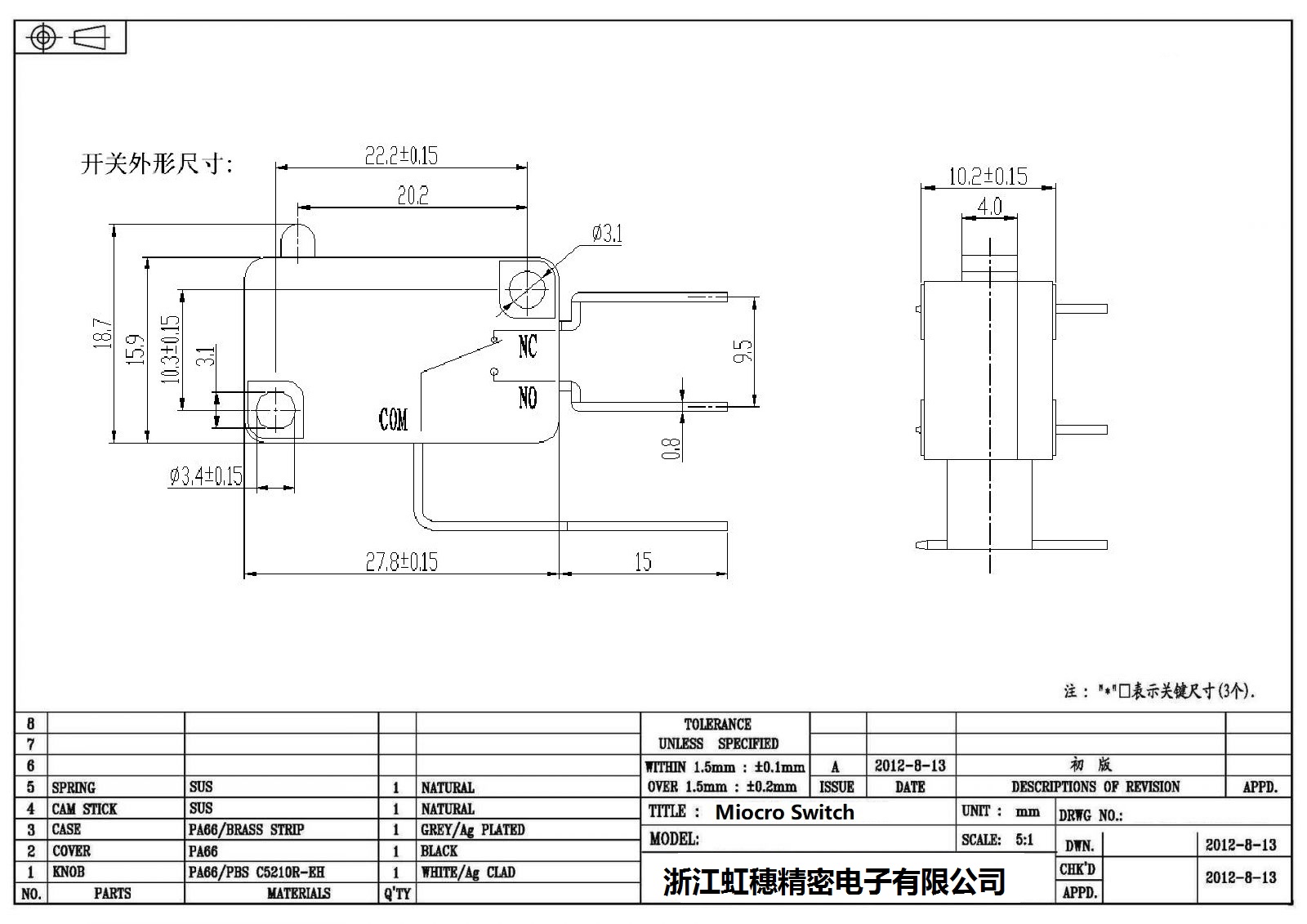 .请根据额定值电流、操作负载、驱动杆的种类、使用温度等要求选择合适型号的开关;