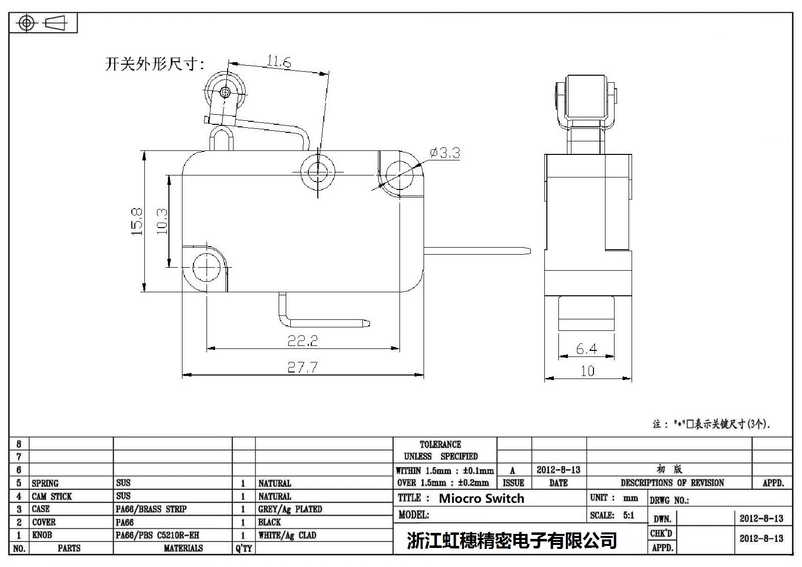 .请根据额定值电流、操作负载、驱动杆的种类、使用温度等要求选择合适型号的开关;