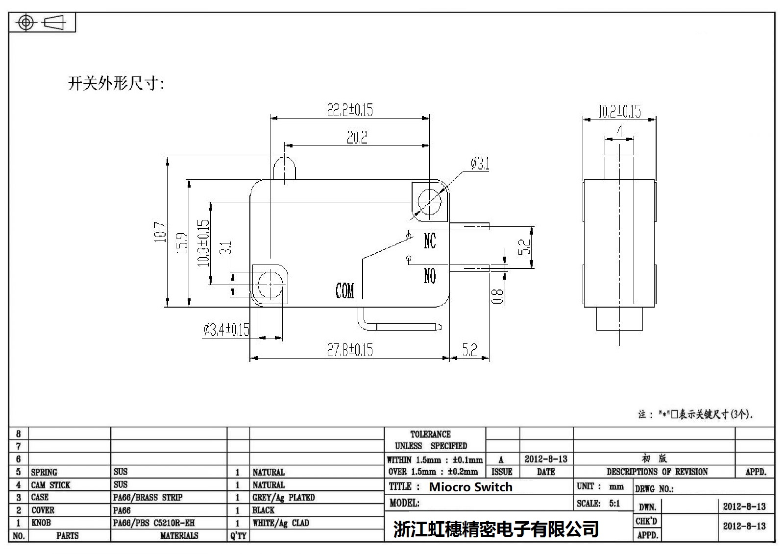 .请根据额定值电流、操作负载、驱动杆的种类、使用温度等要求选择合适型号的开关;