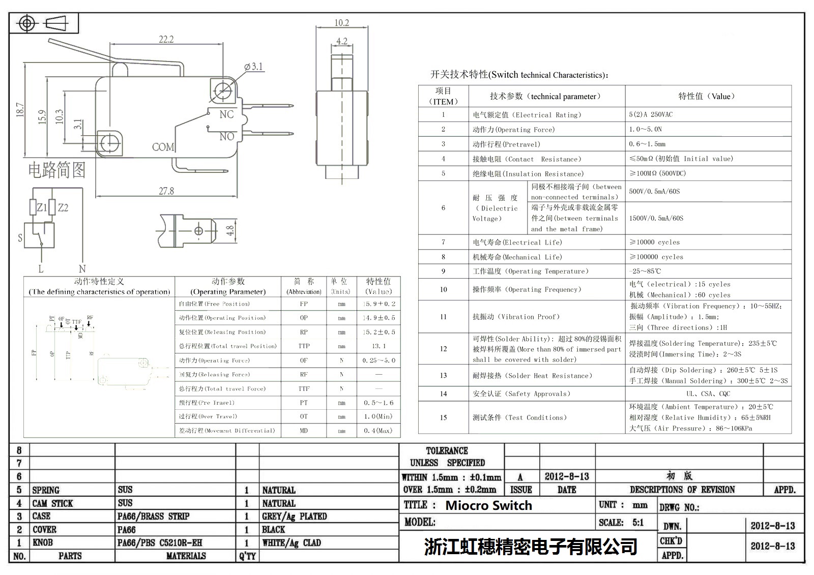 .请根据额定值电流、操作负载、驱动杆的种类、使用温度等要求选择合适型号的开关;