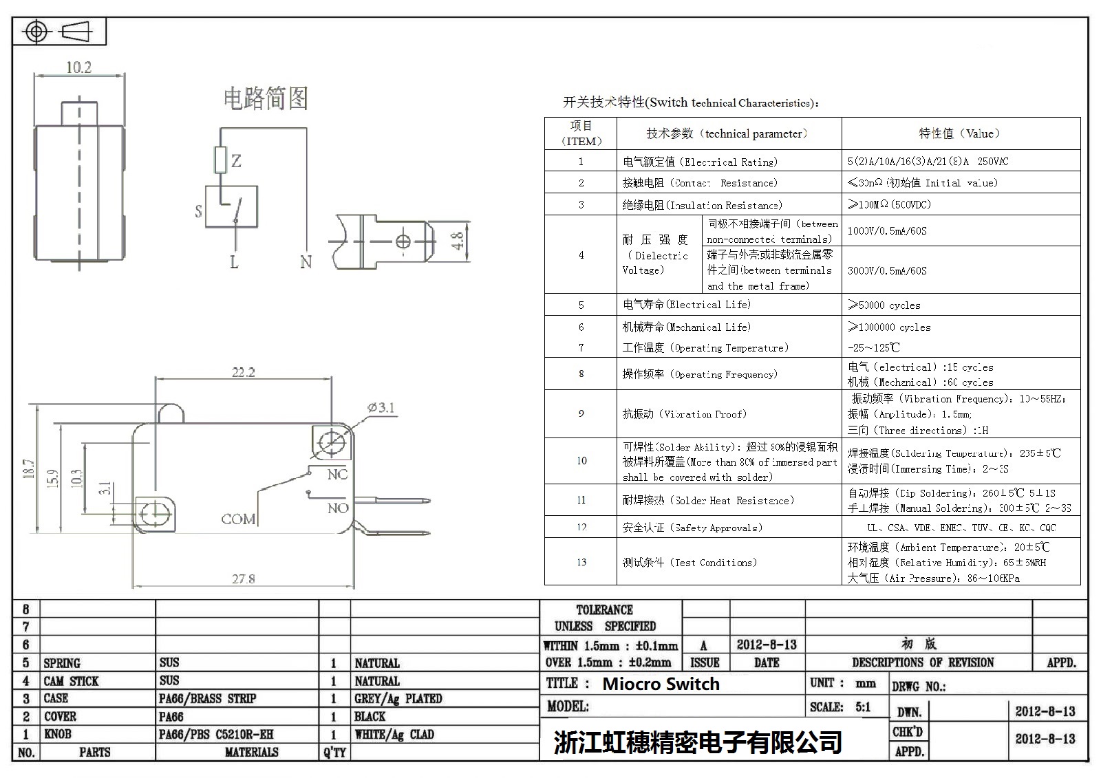 .请根据额定值电流、操作负载、驱动杆的种类、使用温度等要求选择合适型号的开关;