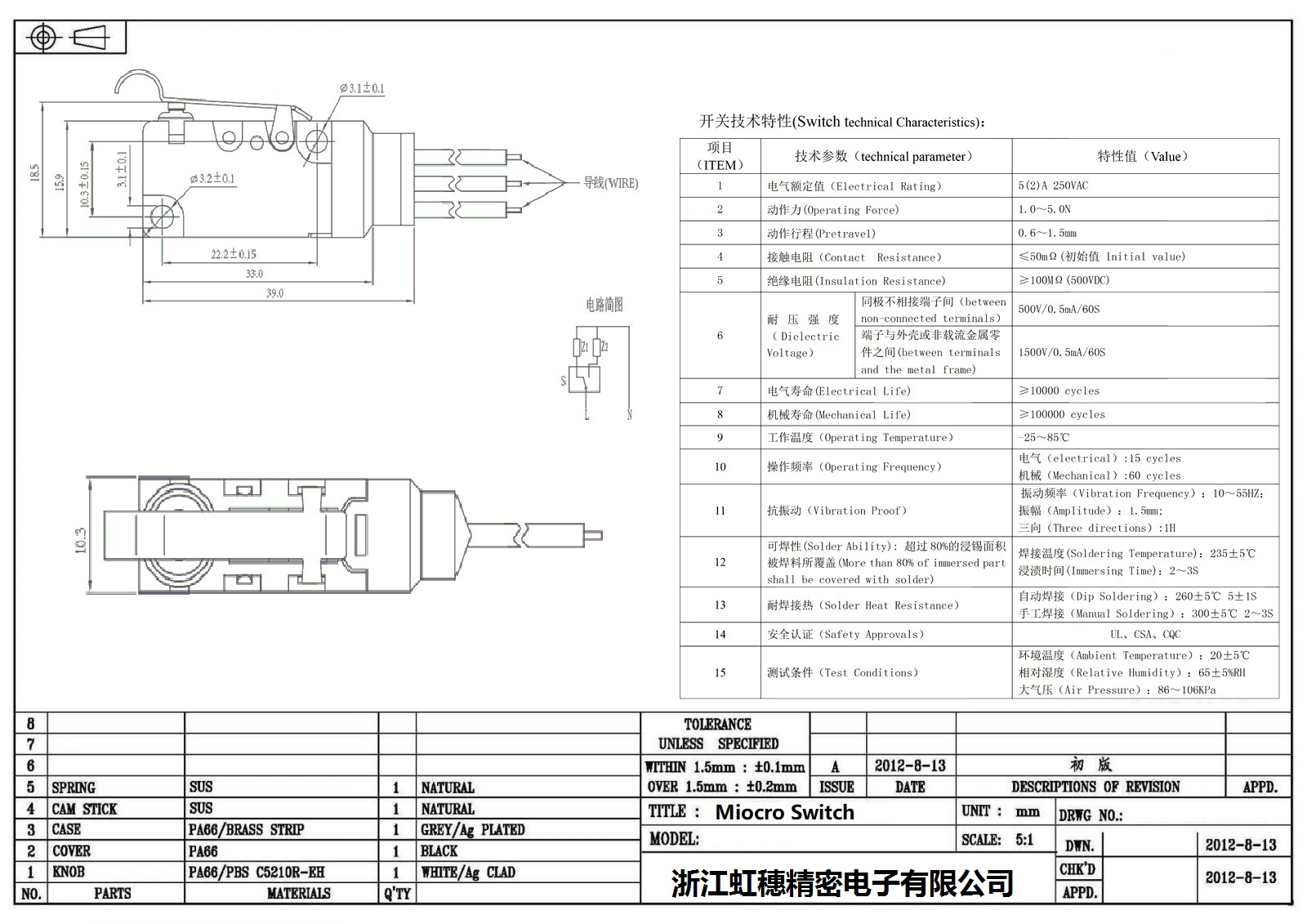 .请根据额定值电流、操作负载、驱动杆的种类、使用温度等要求选择合适型号的开关;