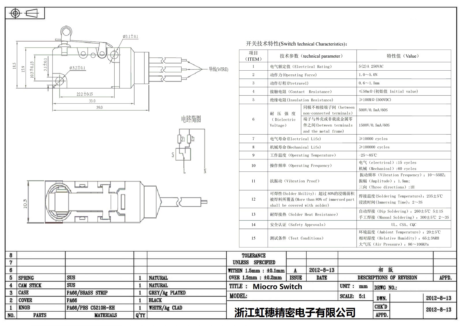 .请根据额定值电流、操作负载、驱动杆的种类、使用温度等要求选择合适型号的开关;
