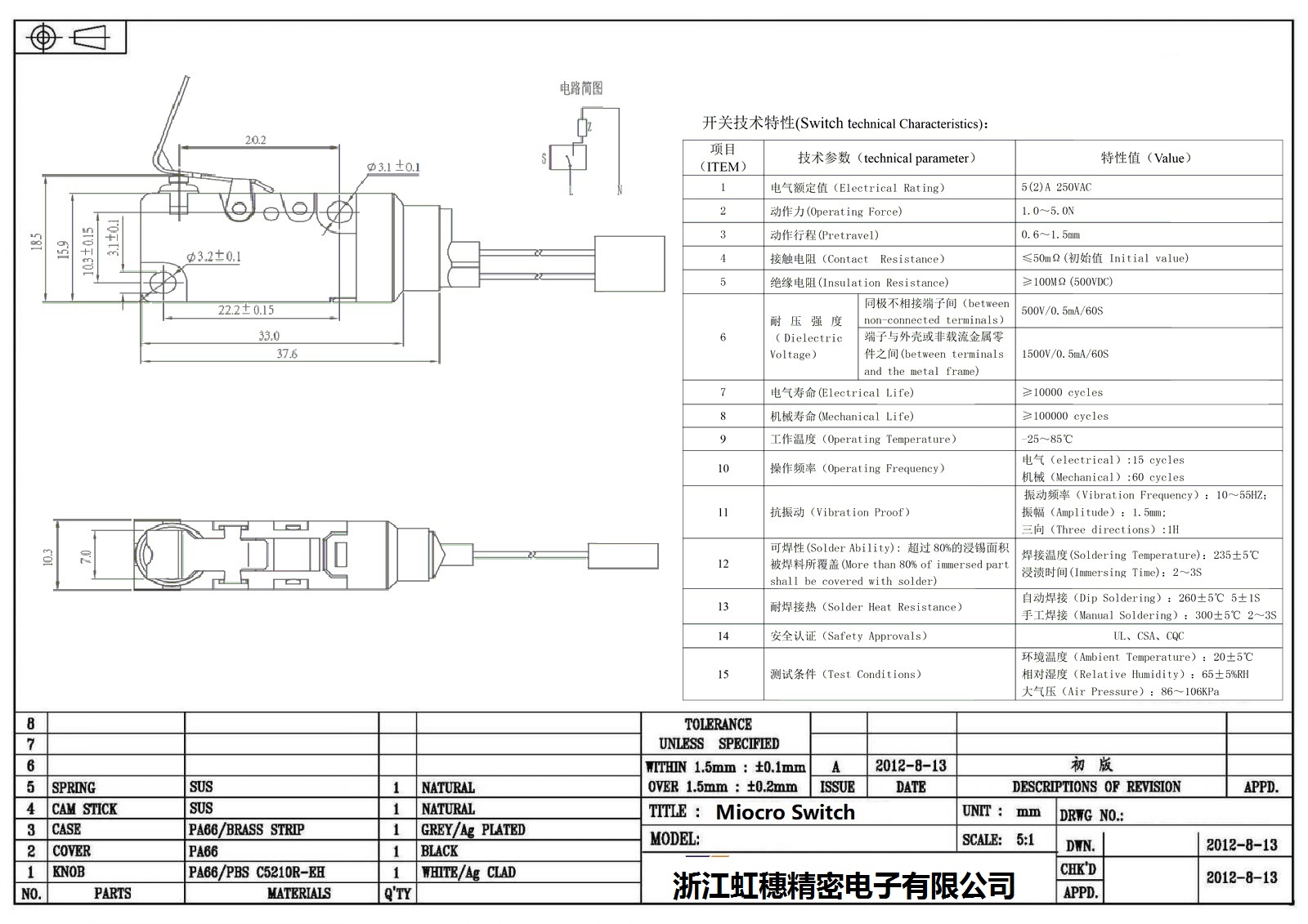 .请根据额定值电流、操作负载、驱动杆的种类、使用温度等要求选择合适型号的开关;