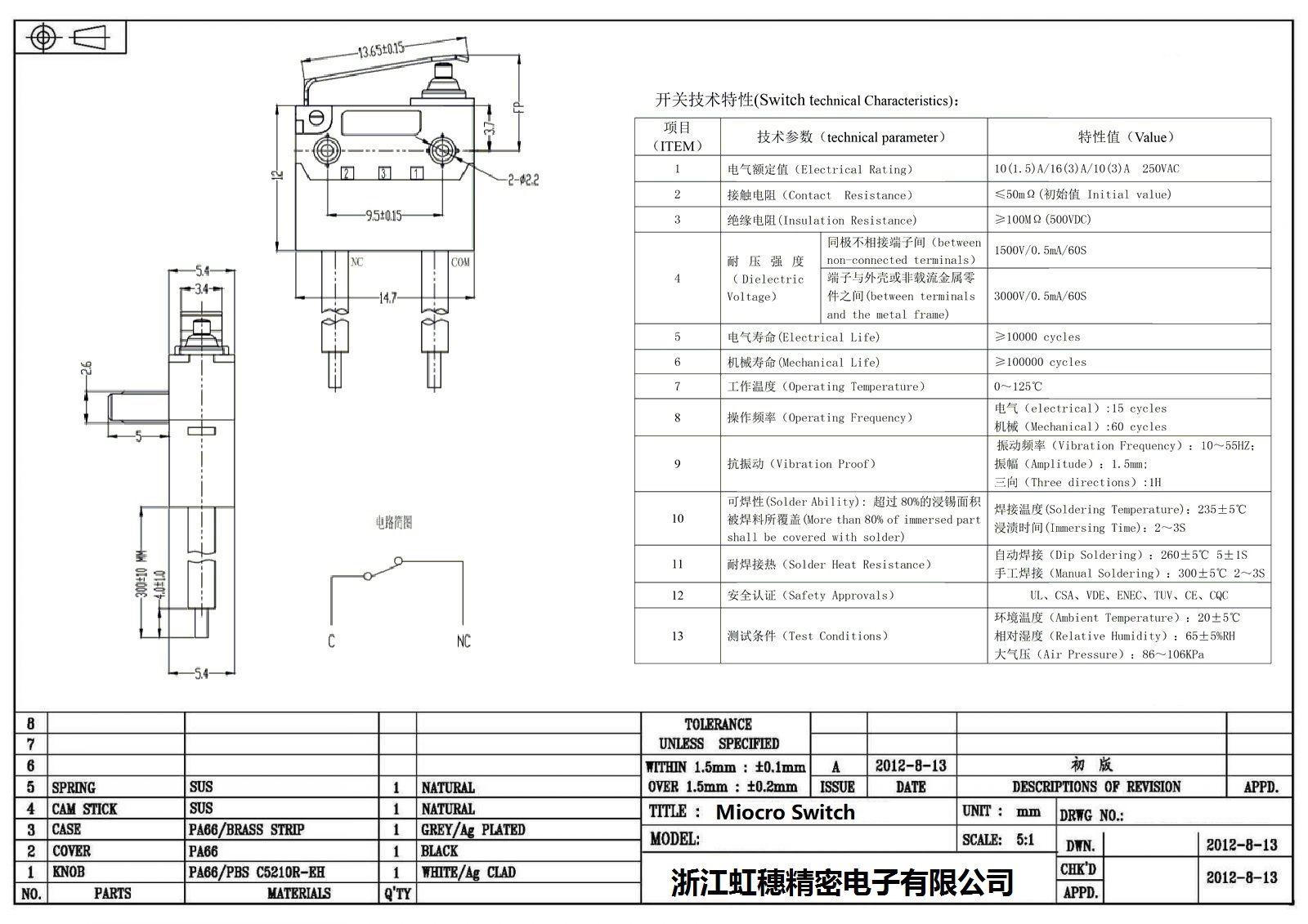 一.请根据额定值电流、操作负载、驱动杆的种类、使用温度等要求选择合适型号的开关;