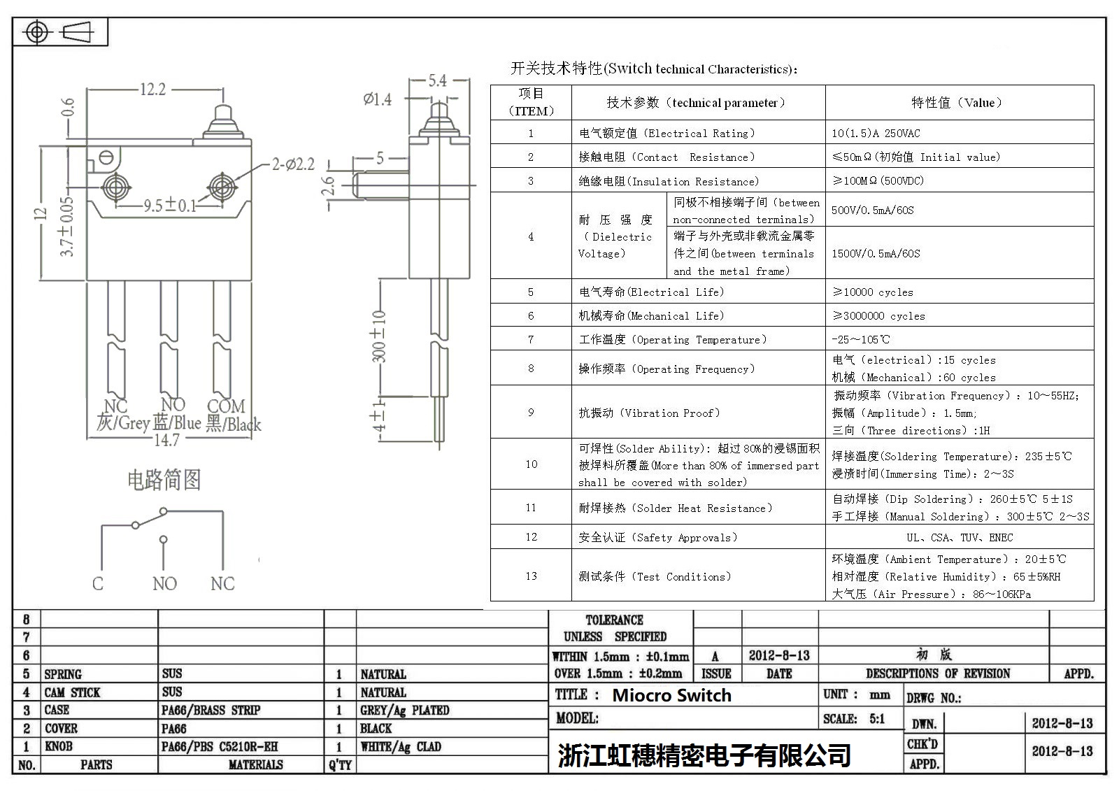 .请根据额定值电流、操作负载、驱动杆的种类、使用温度等要求选择合适型号的开关;