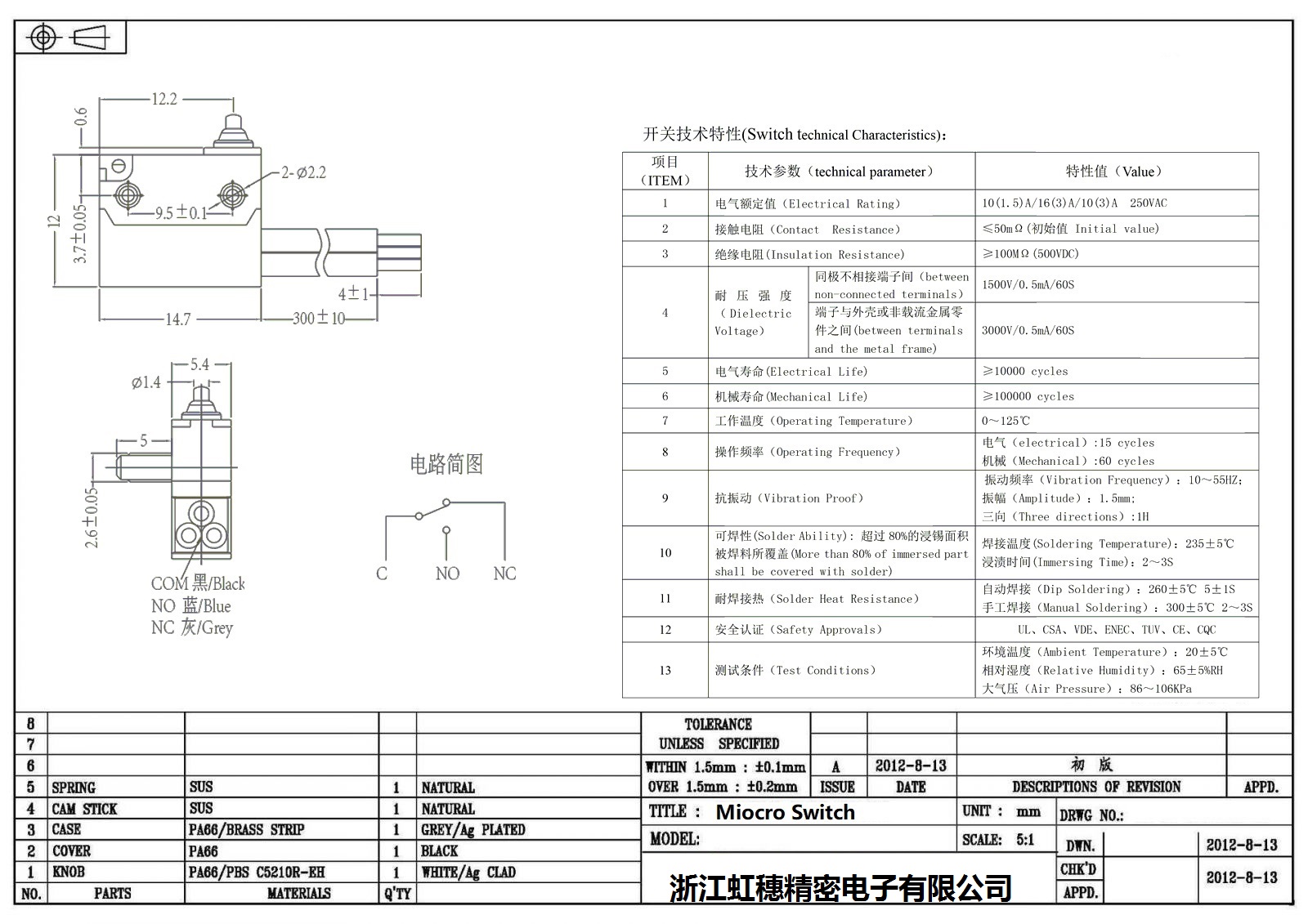 .请根据额定值电流、操作负载、驱动杆的种类、使用温度等要求选择合适型号的开关;