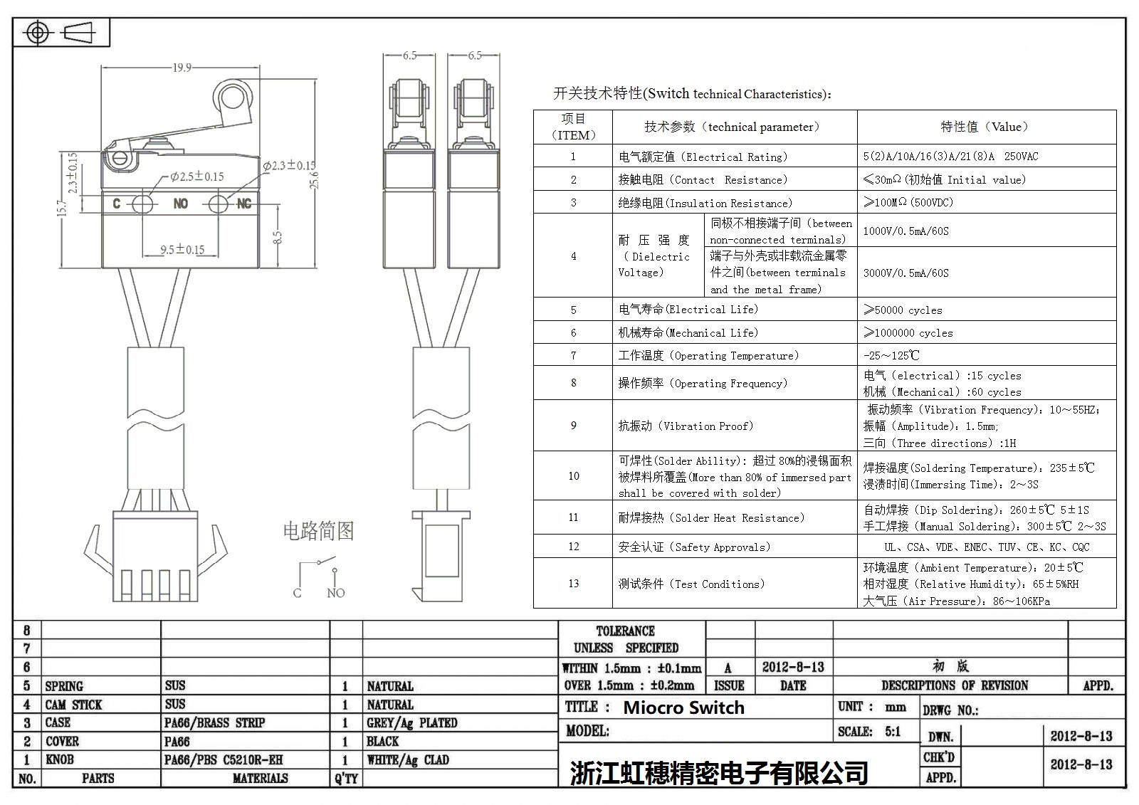 .请根据额定值电流、操作负载、驱动杆的种类、使用温度等要求选择合适型号的开关;