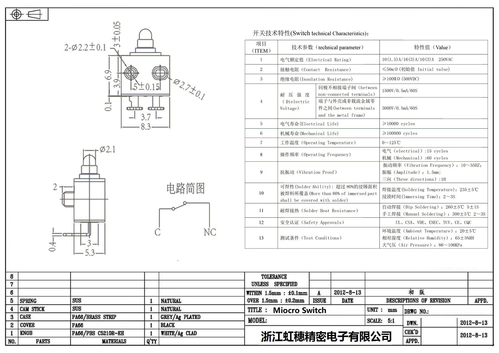 .请根据额定值电流、操作负载、驱动杆的种类、使用温度等要求选择合适型号的开关;