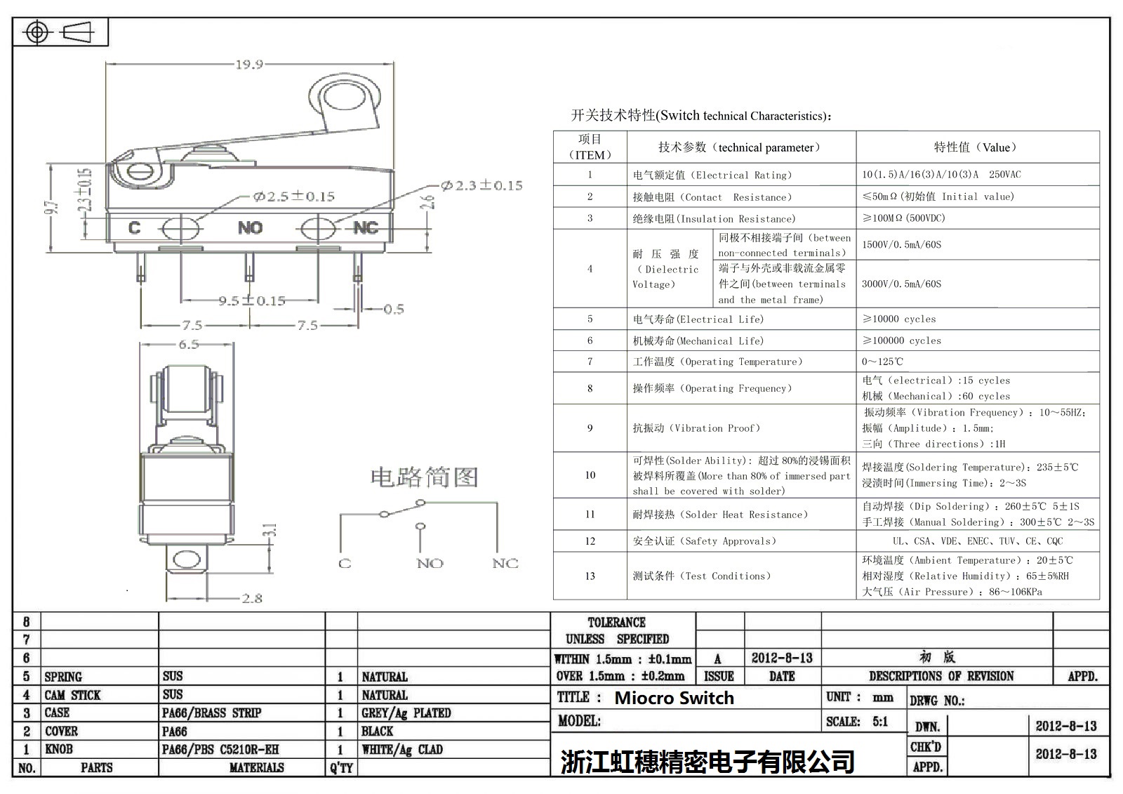 .请根据额定值电流、操作负载、驱动杆的种类、使用温度等要求选择合适型号的开关;
